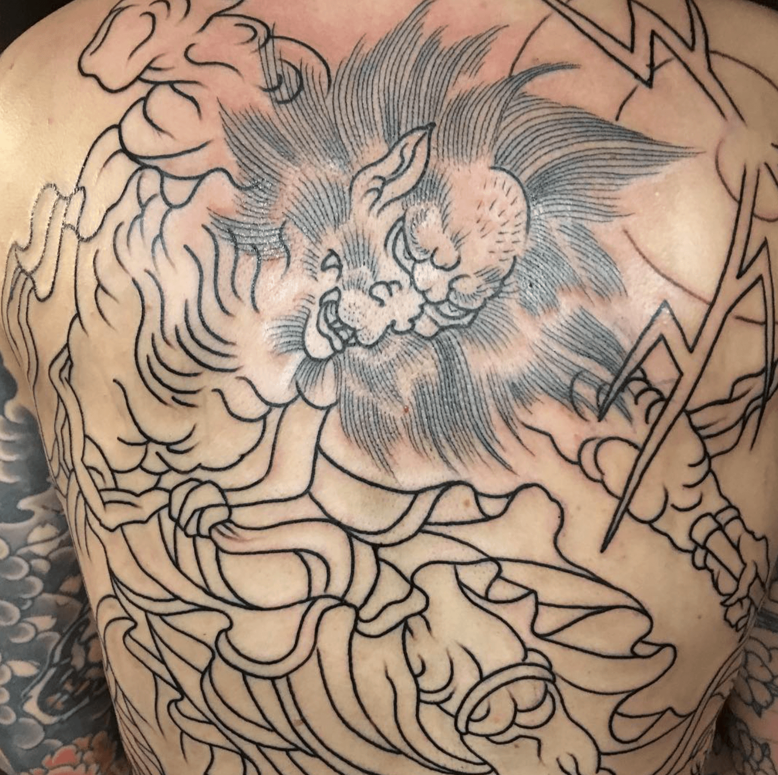 Good start on this Raijin & dragon back piece last night on my friend David Ryf who flew all the way out from Switzerland. Follow him at @david_ryf, he's a super talented kid!