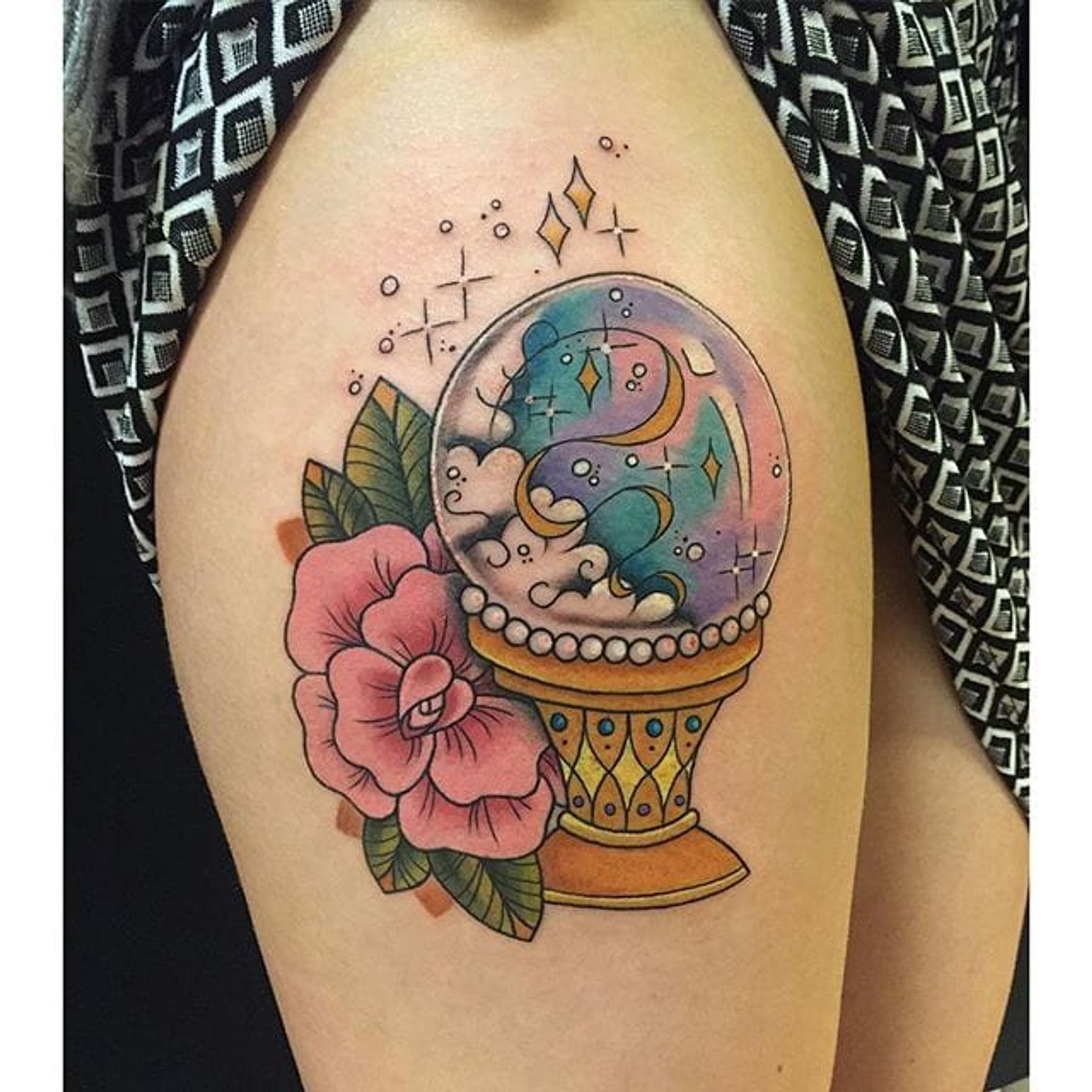 Crystal Ball Tattoo by Rachelle Downs #crystalball #fortuneteller #traditional #rachelledowns