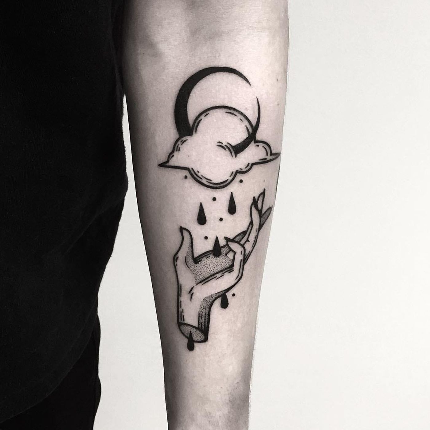 Magic hand tattoo by Poltergeist #Poltergeist #cooltattoos #blackwork #Linework #dotwork #moon #cloud #rain #raindrops #hand #magic #alchemy #symbol #tattoooftheday