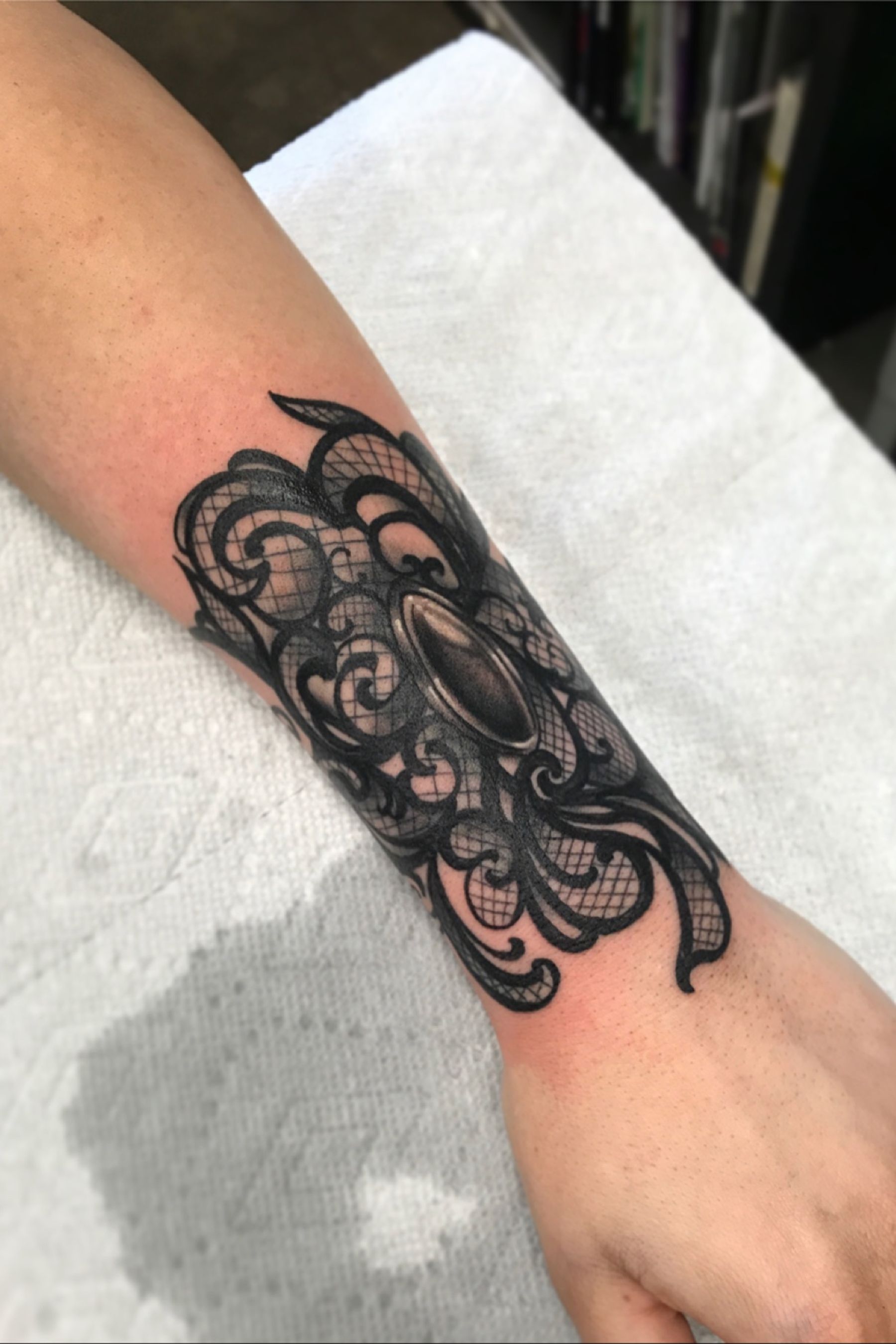Custom freehand lace arm band #lace #neotraditional #tattoo #tattooshop #crts #clandestinerabbit #linework #blackandgrey #stencil #style #flow #eternalink #jewel #fkirons #linework #style #flow