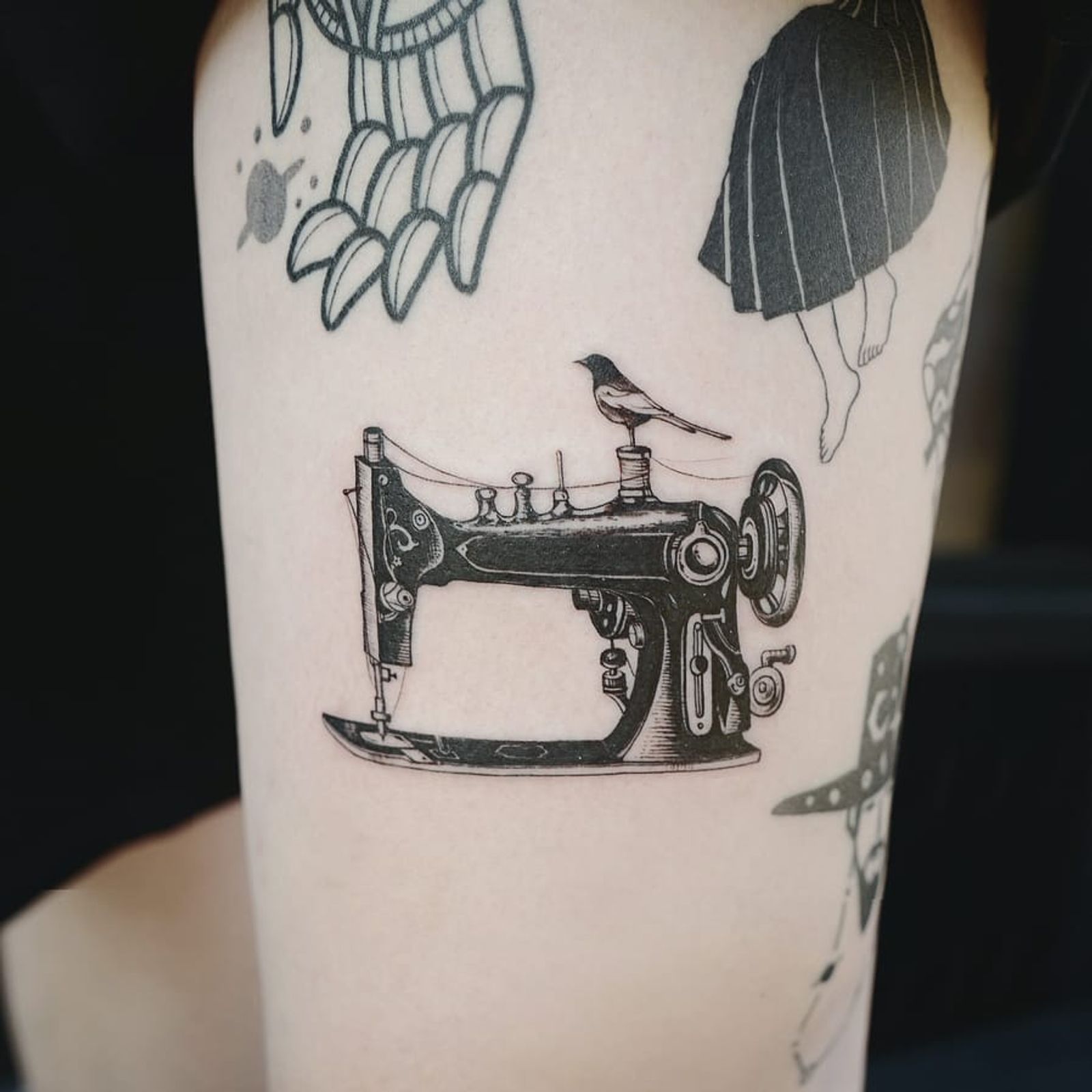 Sewing machine tattoo by Tattooist Banul #Banul #fashiontattoos #blackwork #fineline #detailedblackwork #small #sewingmachine #realistic #bird #sewing #craft #fashion #style #tattoooftheday