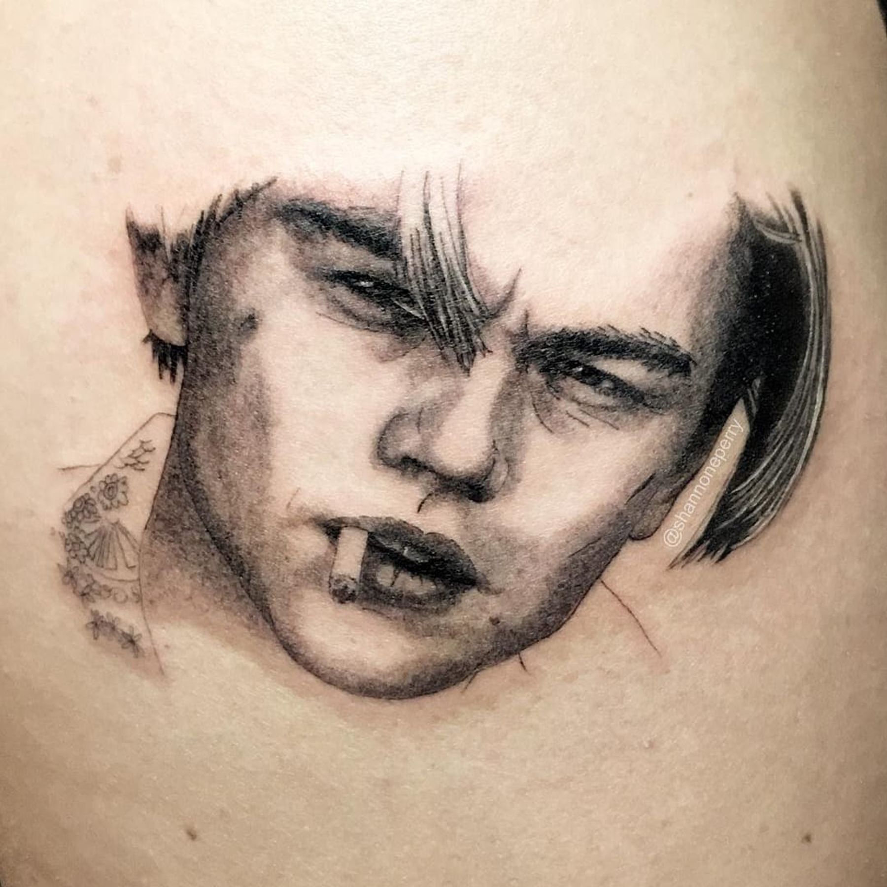 Romeo and Juliet tattoo by Shannon Perry #ShannonPerry #movietattoos #linework #fineline #blackandgrey #realistic #illustrative #LeonardoDiCaprio #RomeoandJuliet #smoking #cigarette #tattoooftheday