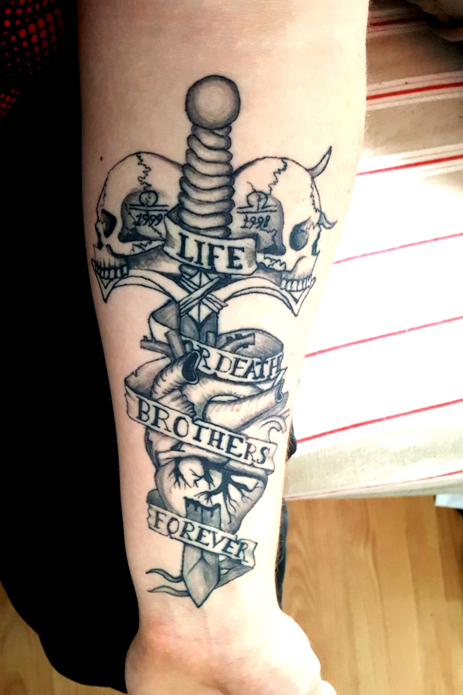Life or Death Brothers Forever First Tattoo Sword Heart Skull BlackWork