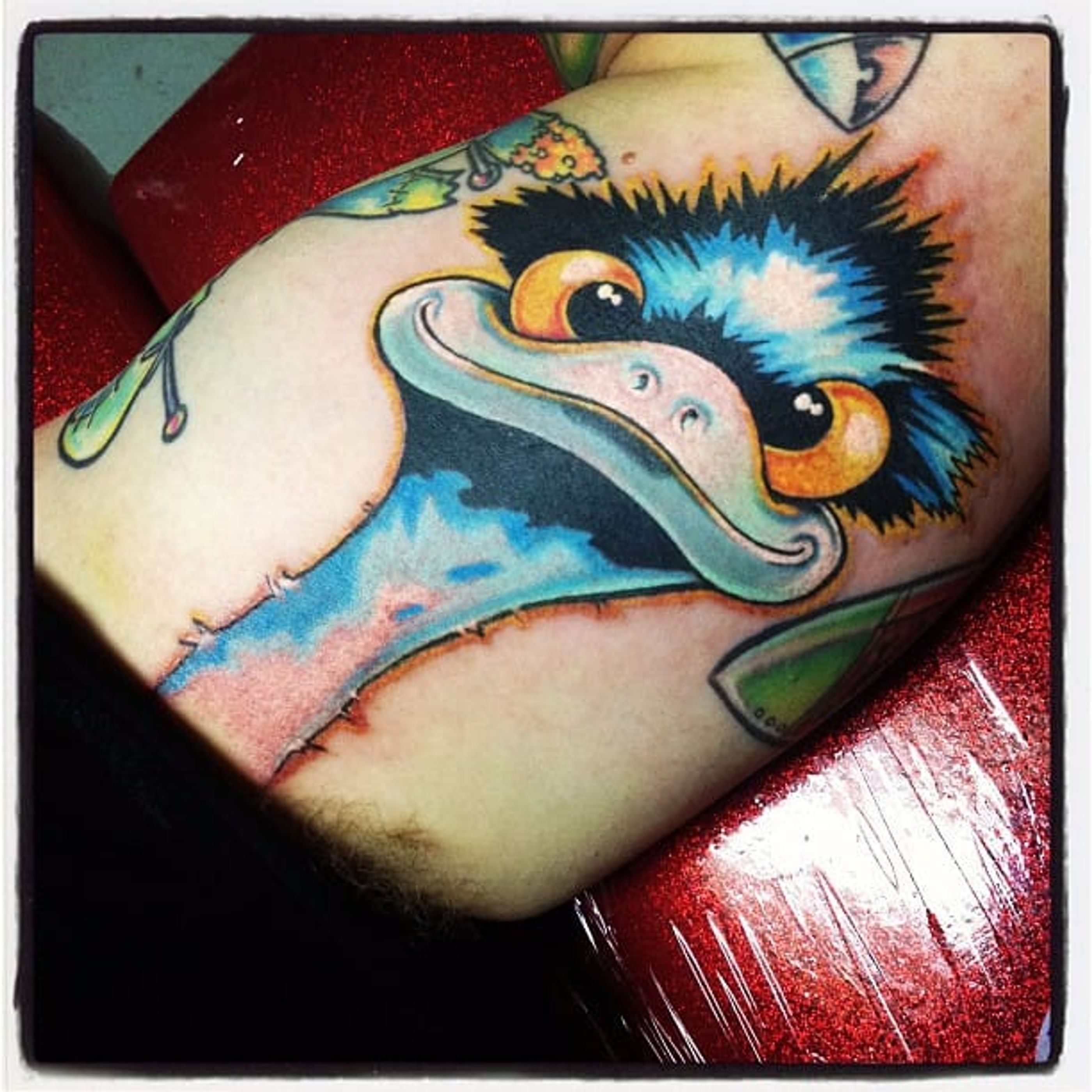 Cheeky new school emu tattoo poking out from an armpit. Tattoo by Blake Blame. #emu #Australia #Australiananimal #Australianfauna #BlakeBlame #newschool