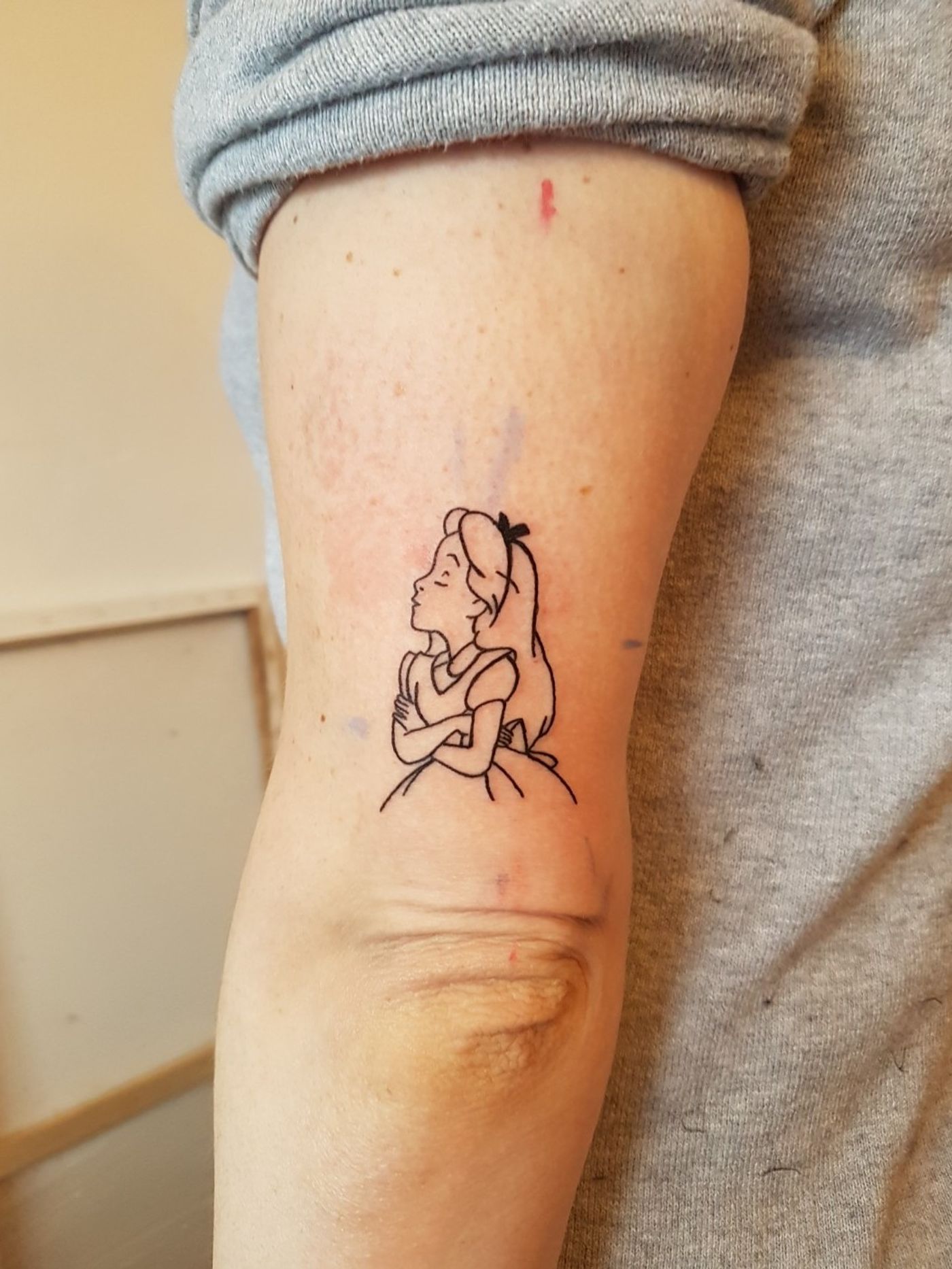 Alice from Alice in Wonderland (Disney cartoon), by Estelle Peyronnenc, London, UK. Back arm tattoo. #aliceinwonderland #backarm #disney