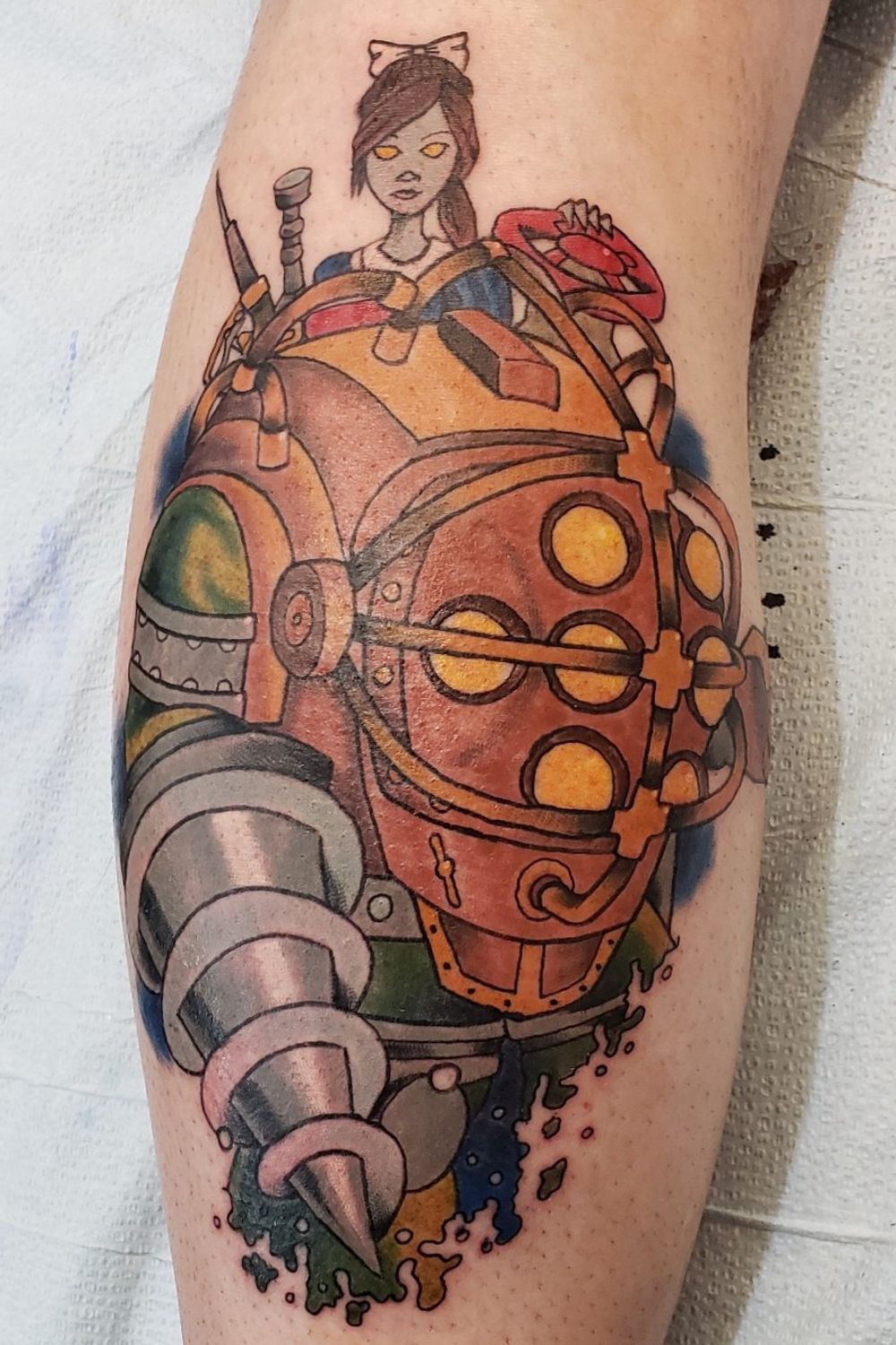 Tattoo from a game called bioshock, a little sister from bioshock 2 riding the big daddy.