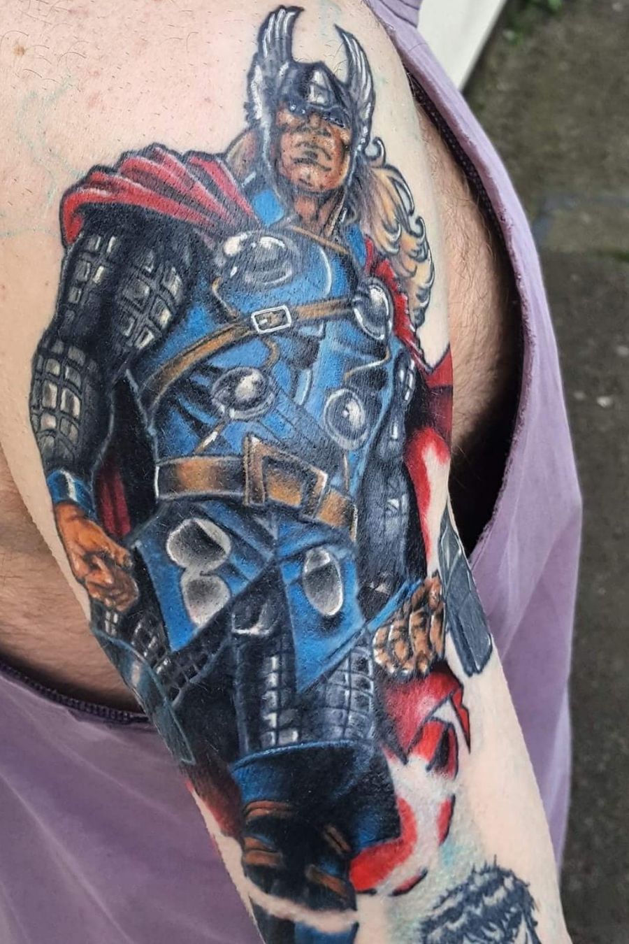 Marvel sleeve cover-up by Pete. So far, Thor & half way through the Hulk. Plenty more to go! Remember, quality, detailed tattoos that last, take time. Pure artwork.#MarvelTattoos #MarvelTattoo #thortattoo #thor #colourtattoo #sleevetattoo #coveruptattoo #CoverUpTattoos #cartoontattoo #inprogresstattoo #menwithink #inkedup #inked
