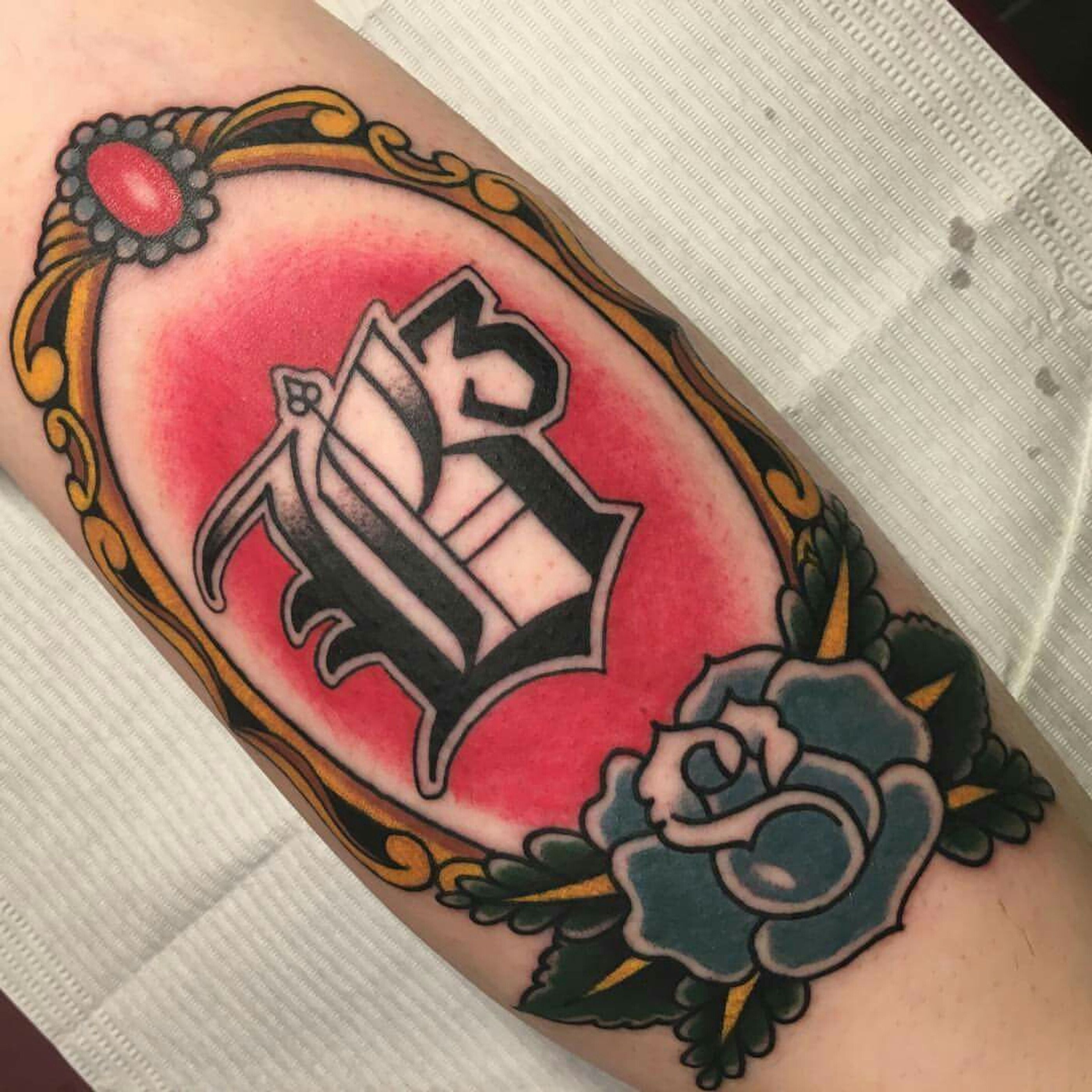 #traditionaltattoo #traditional #lettering #frame #gold #red #rose #roses #ornate #oldEnglish #vibrant
