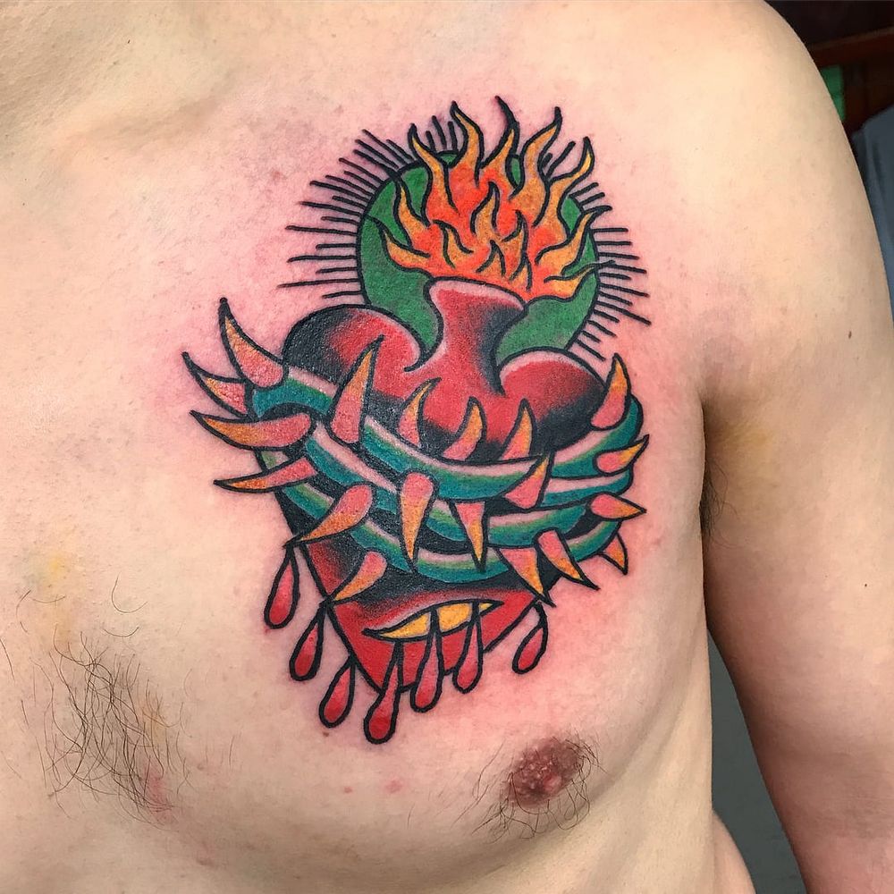 Tattoo by Robert Ryan #RobertRyan #color #traditional #sacredheart #Christianity #Catholic #heart #thorns #fire #blood #light #love