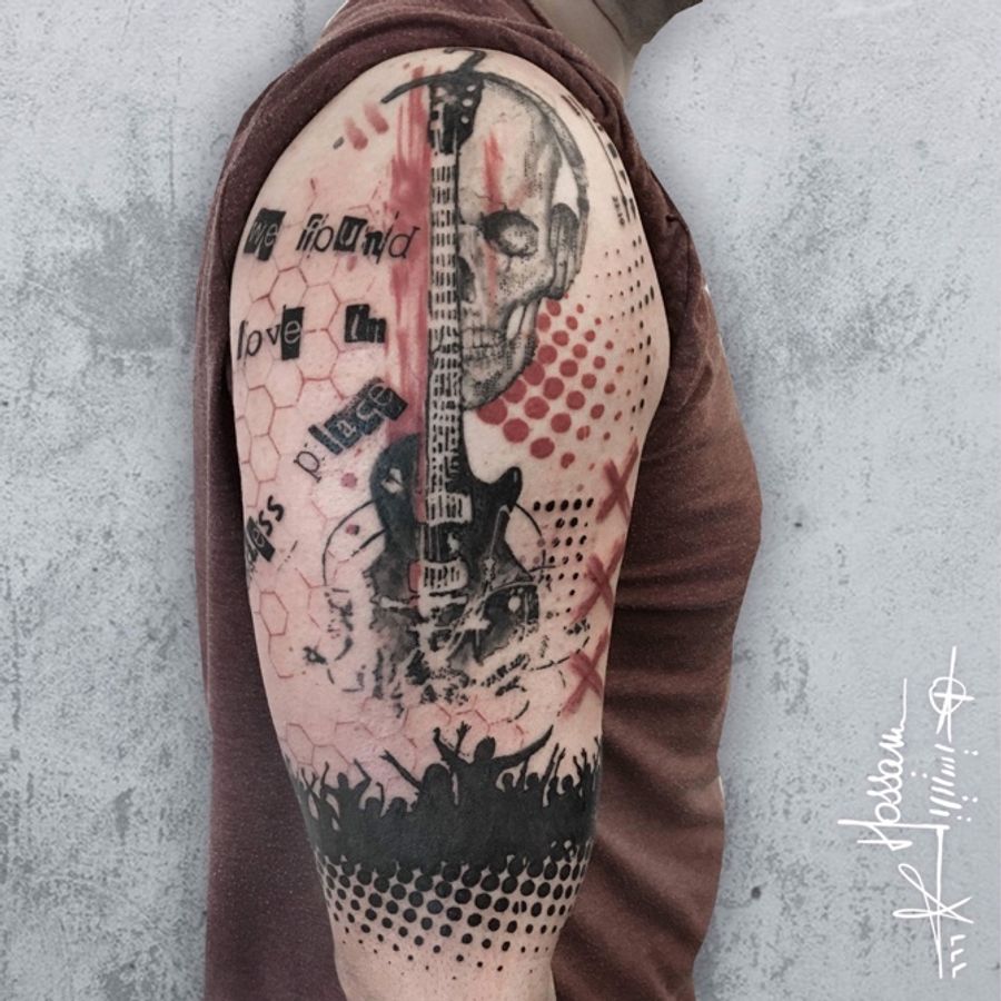 Trash polka amsterdam hysteria tattoo ,skull guitar rock music theme
