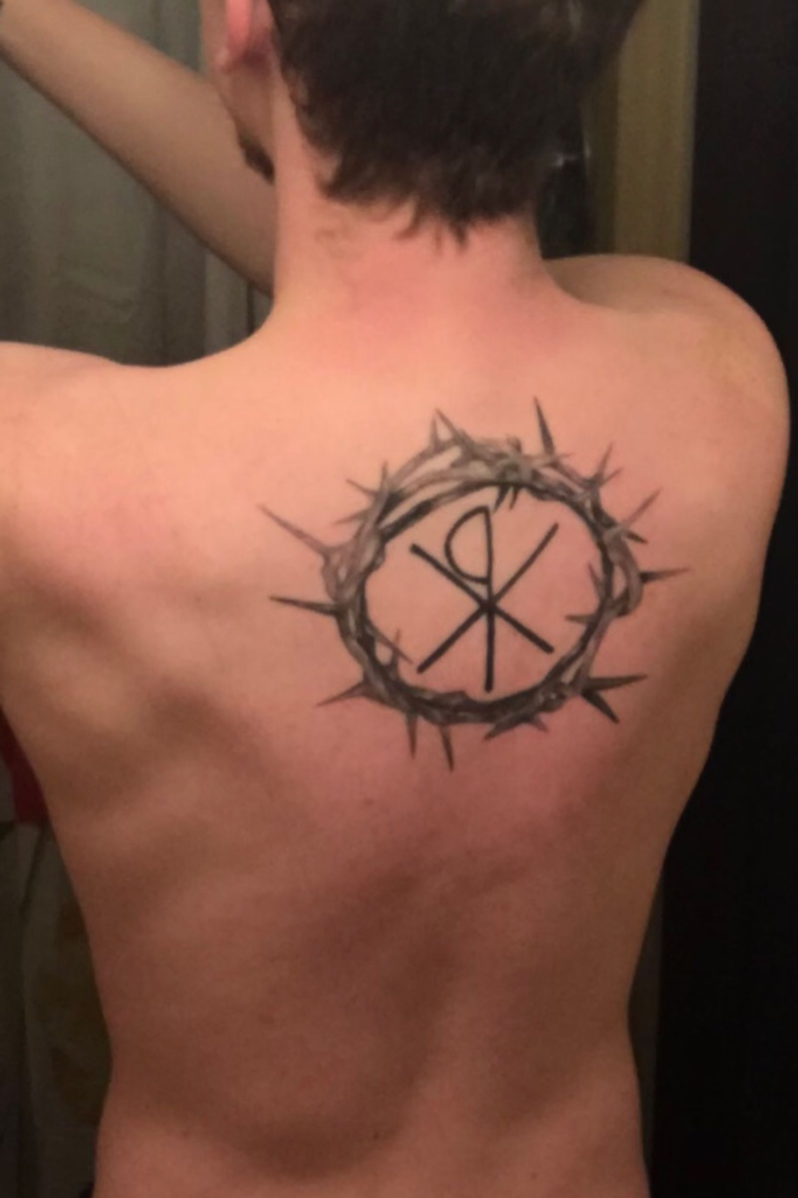 The Chi-Rho (pronounced "KEE-roe") is a Christian symbol consisting of the intersection of the capital Greek letters Chi (Χ) and Rho (Ρ), which are the first two letters of "Christ" in Greek (ΧΡΙΣΤΟΣ, Christos). The Chi-Rho can represent either Christ or Christianity and is also known as a Christogram. And the crown of thorns around it represents the crown he was forced to wear when he died for humanity’s sins.