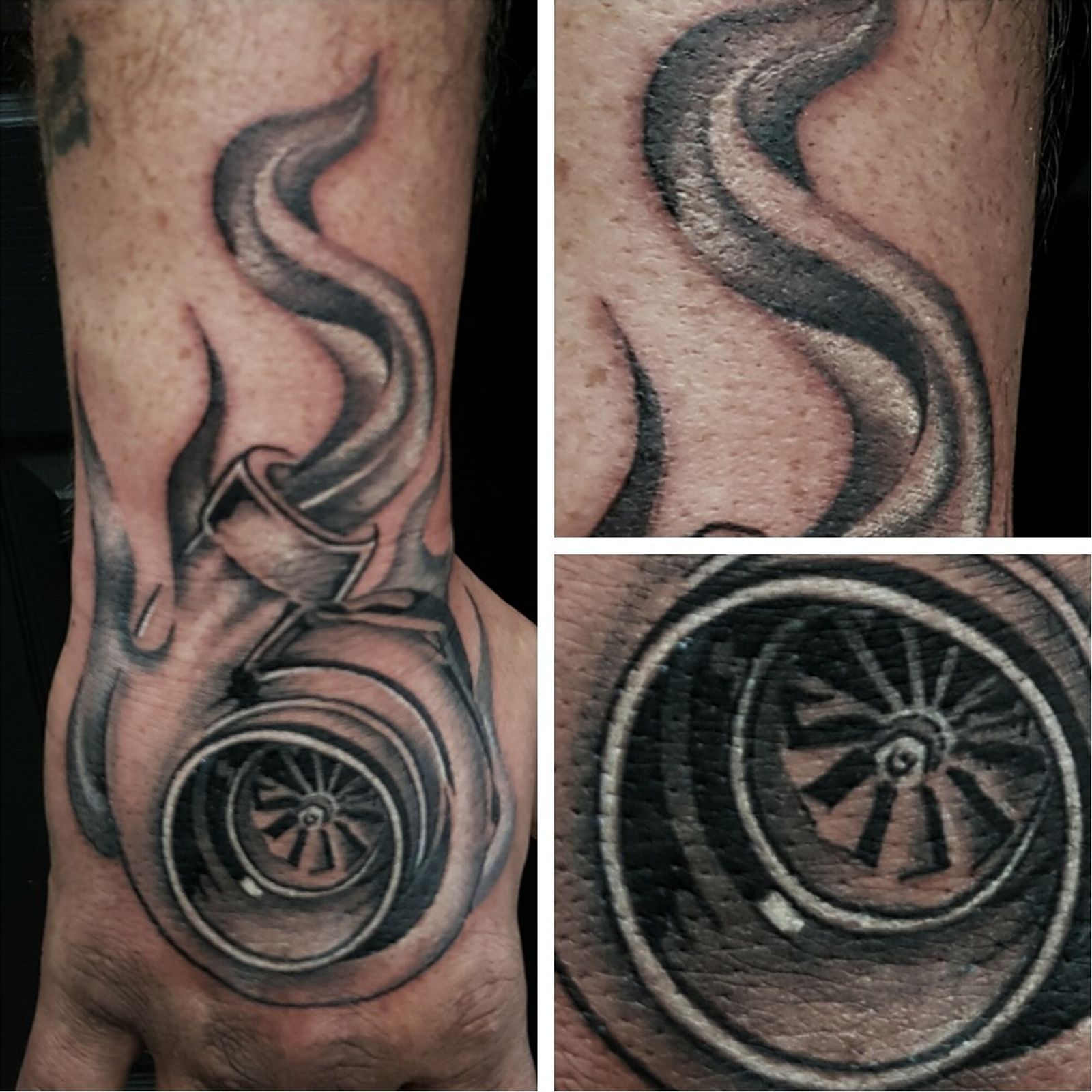 Turbocharger hand piece...#turbo #turbocharger #handtattoo #hand #blackandgreytattoo