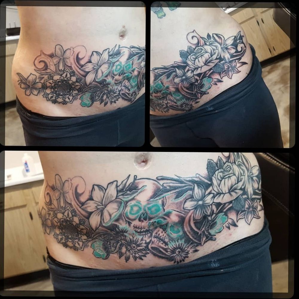 Skull and Flowers Tattoo (tummy tuck scar cover up )➕➕