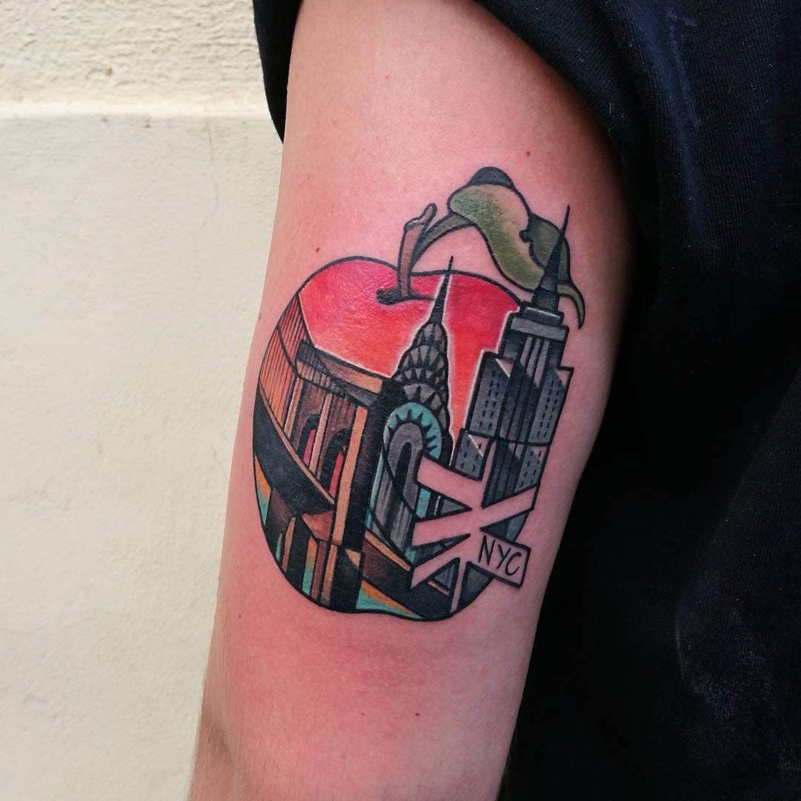 Big apple tattoo by Carmen Caiazzo #CarmenCaiazzo #newyorktattoo #color #traditional #popart #graphicart #mashup #apple #newyorkcity #nyc #apple #bigapple #empirestatebuilding #ChryslerBuilding #architecture