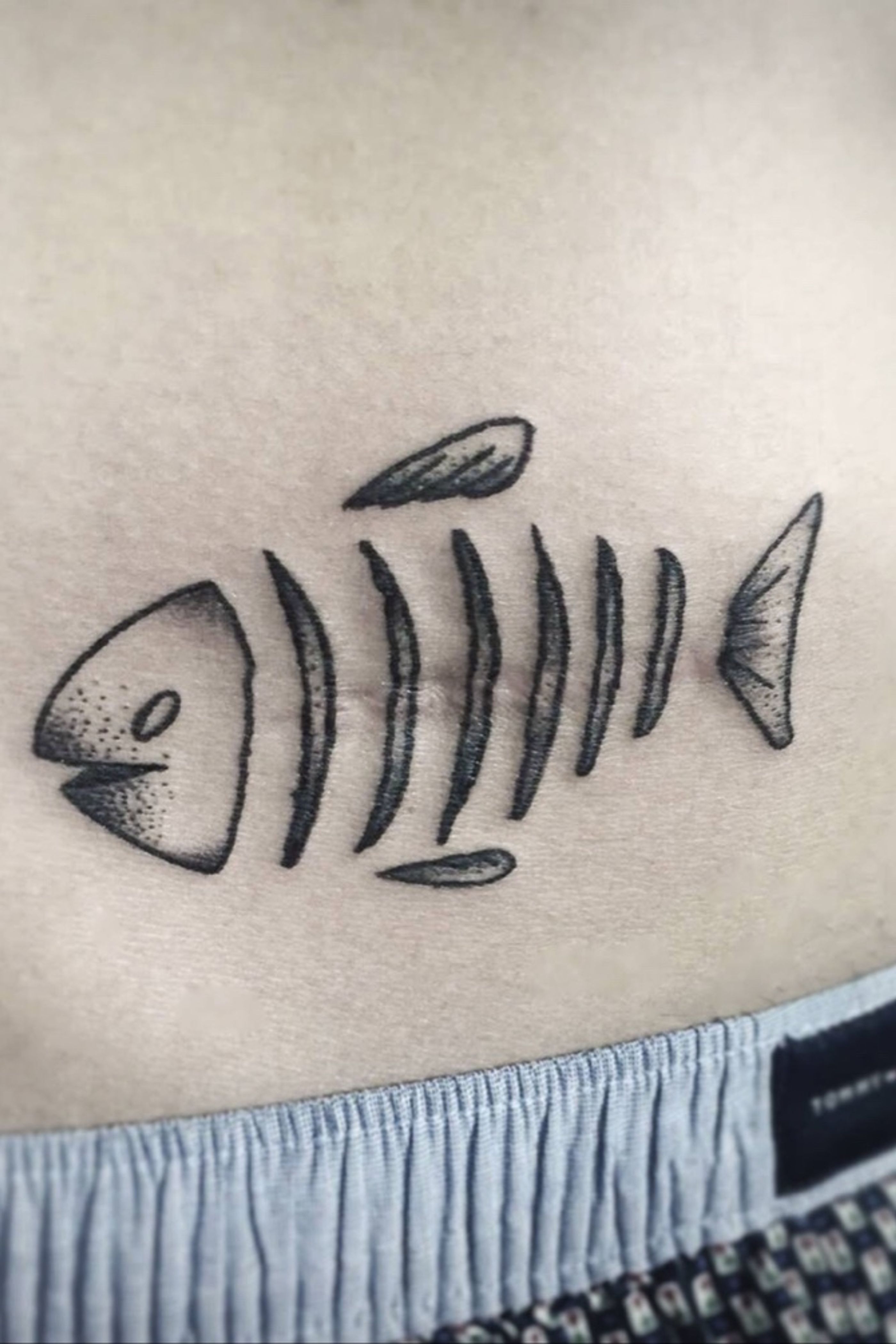 A little fish on a scar of a friend #blackfeatherchild #blackwork #linework #dotwork #occult #blackink #blackinktattoo #fishtattoo #scar #bones #dead