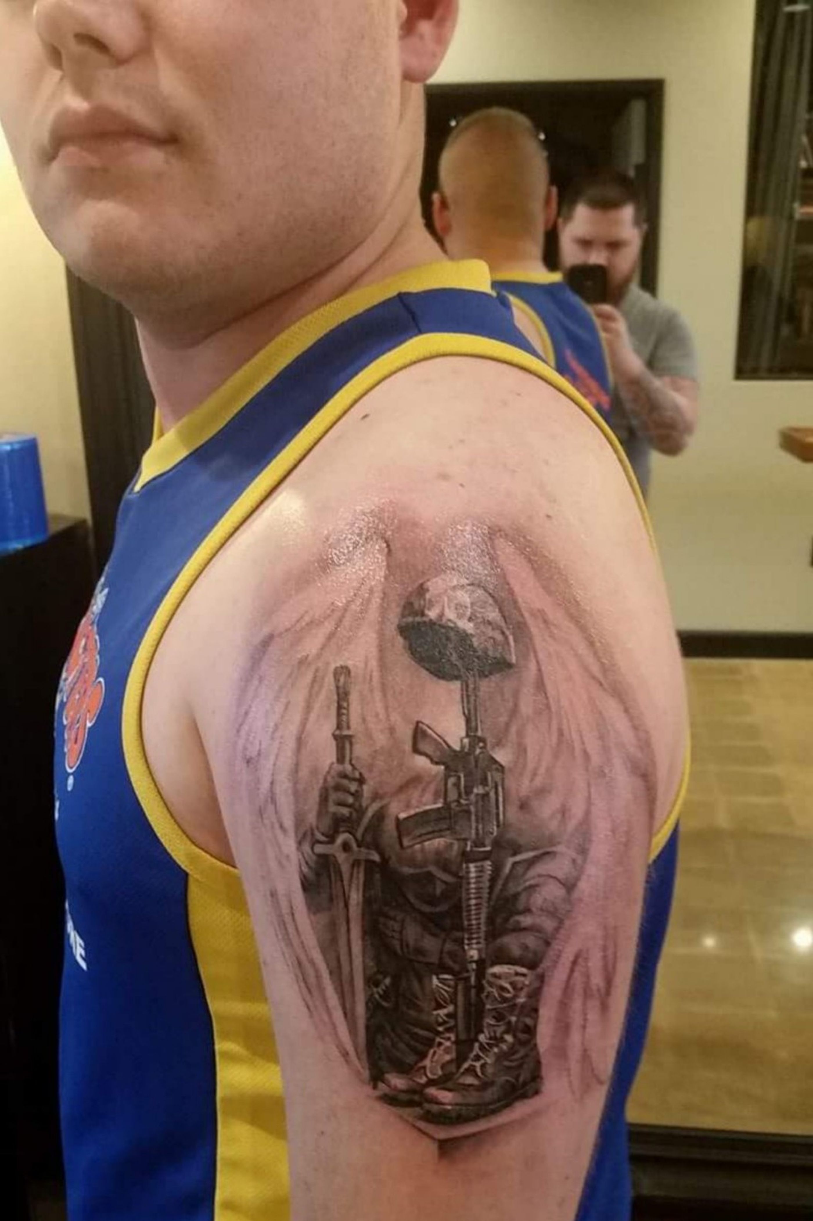 #blackandgreytattoo #realism #battlecross #saintmichael #neverforget #soldier #militarytattoos