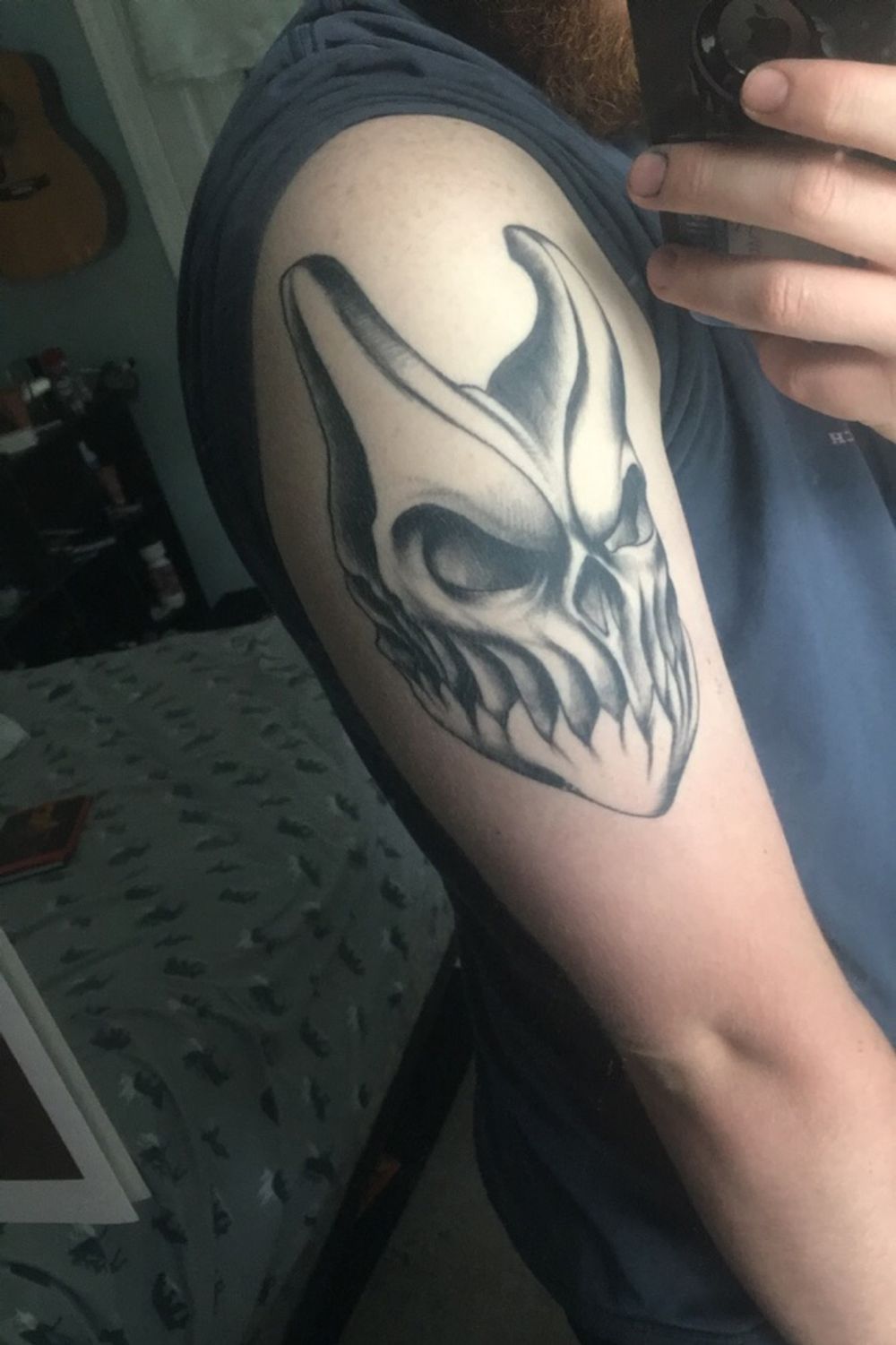 My 2nd tattoo, it’s the mask that Alex wears from slaughter to prevail and Scumsters. It’s a family. #kidofdarkness #slaughtertoprevail #satan