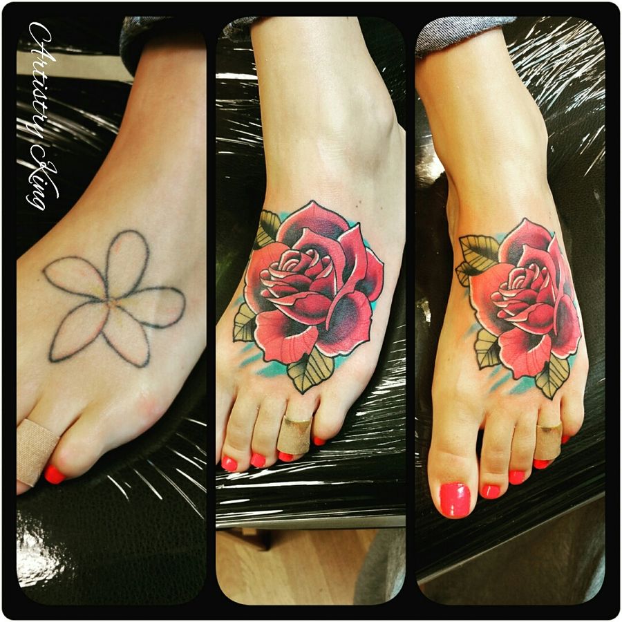 Cover up foot tattoo. Artistry King Tattoo, Vancouver Washington. #coverup #CoverUpTattoos #roses #rosetattoo #foottattoo #colortattoos