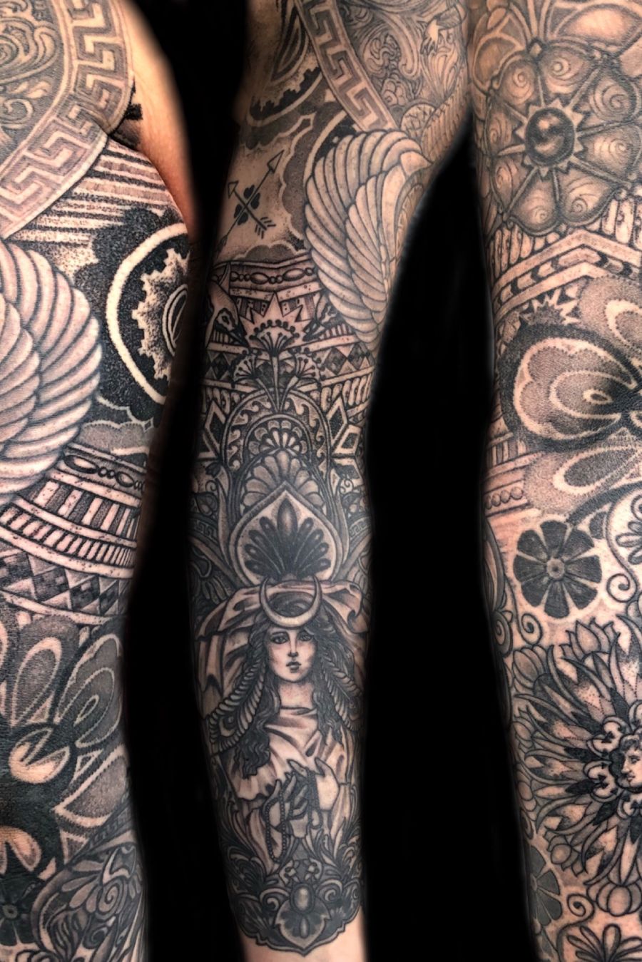 Greek mythology inspired sleeve! Cybele and the mother kf momsters are the larger pieces. The rest is full of patterns and mosiacs inspired by ancient pottery, palace of knossos, mythological stories, alexander the great and many other references!