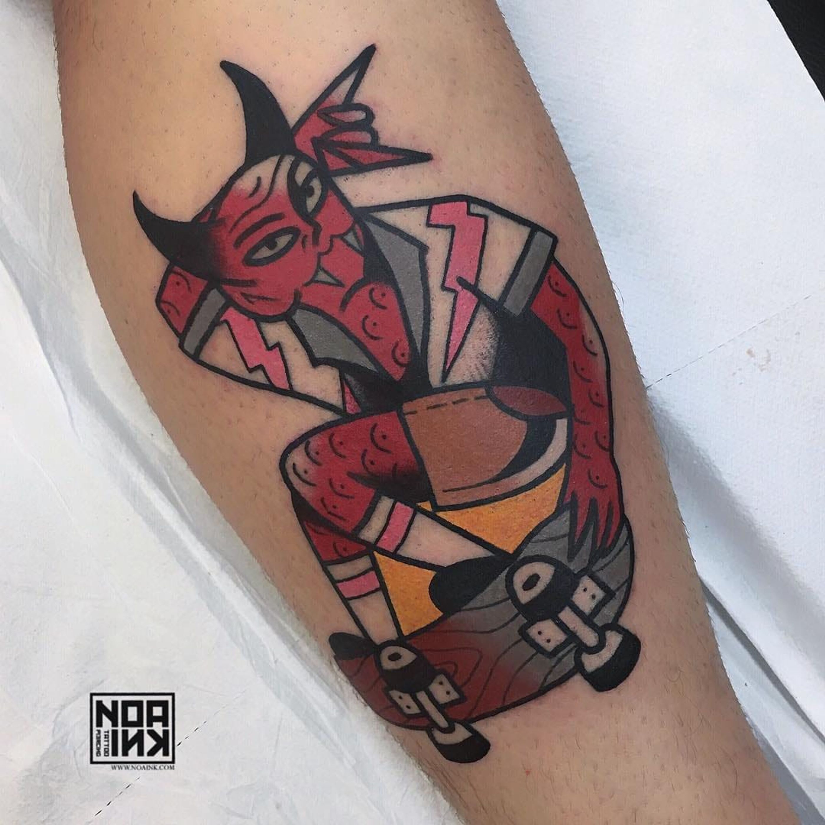 Tattoo by Ian Giuntoli #IanGiuntoli #satanictattoo #satan #devil #hell #hades #demon #evil #darkart #skateboard #skating #rockon #horns #lightning #bolt #skate #skateordie
