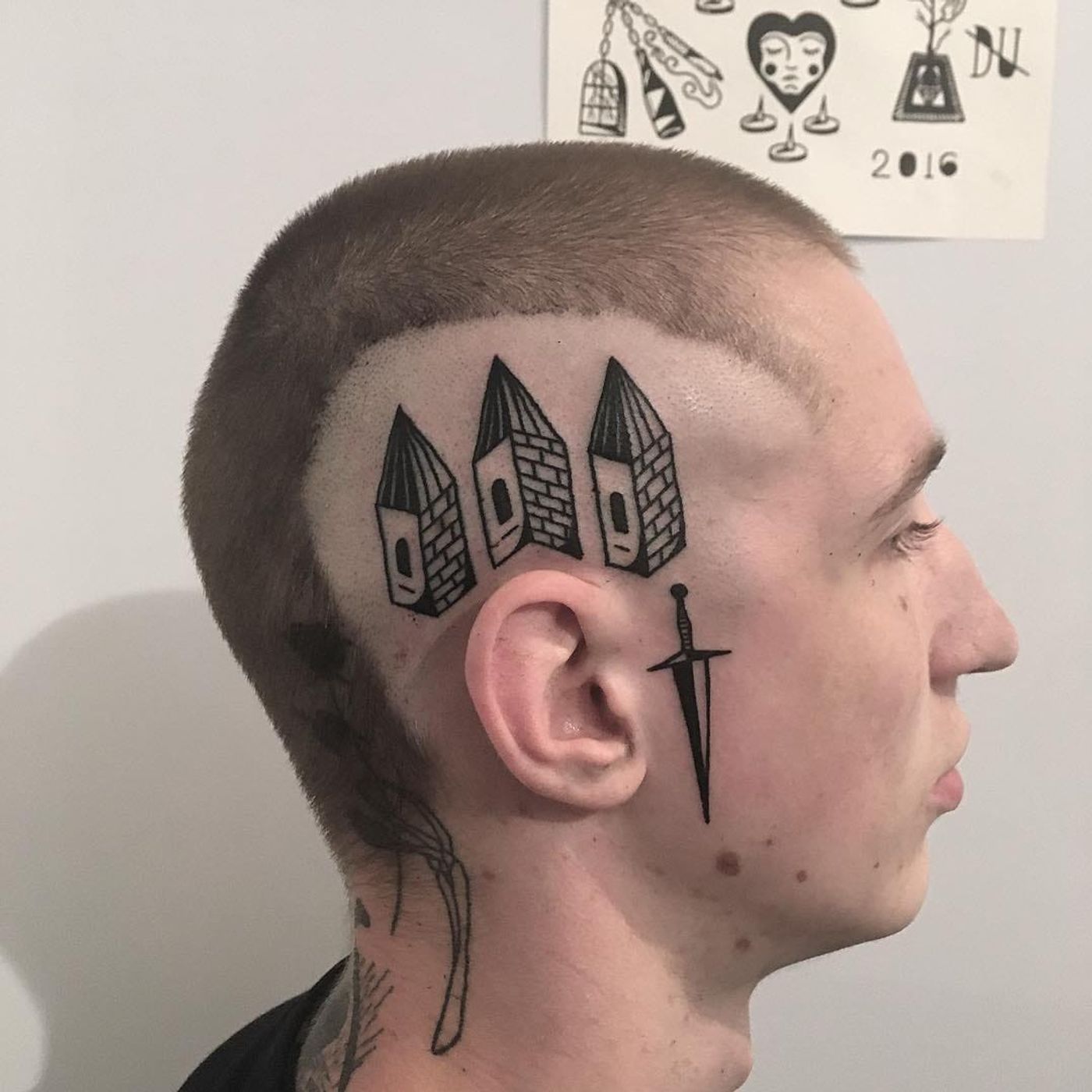 Tattoo by Dima Melancholiac #dimamelancholiac #daggertattoos #dagger #blackwork #illustrative #house #building #facetattoo #knife #sword