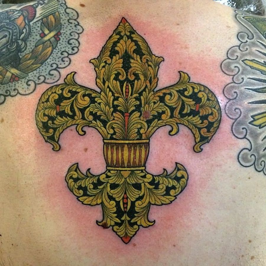 Tattoo by Lynn Akura #LynnAkura #color #neotraditional #fleurdelis #filigree #pattern #leaves #floral #ornamental #gold #goldwork