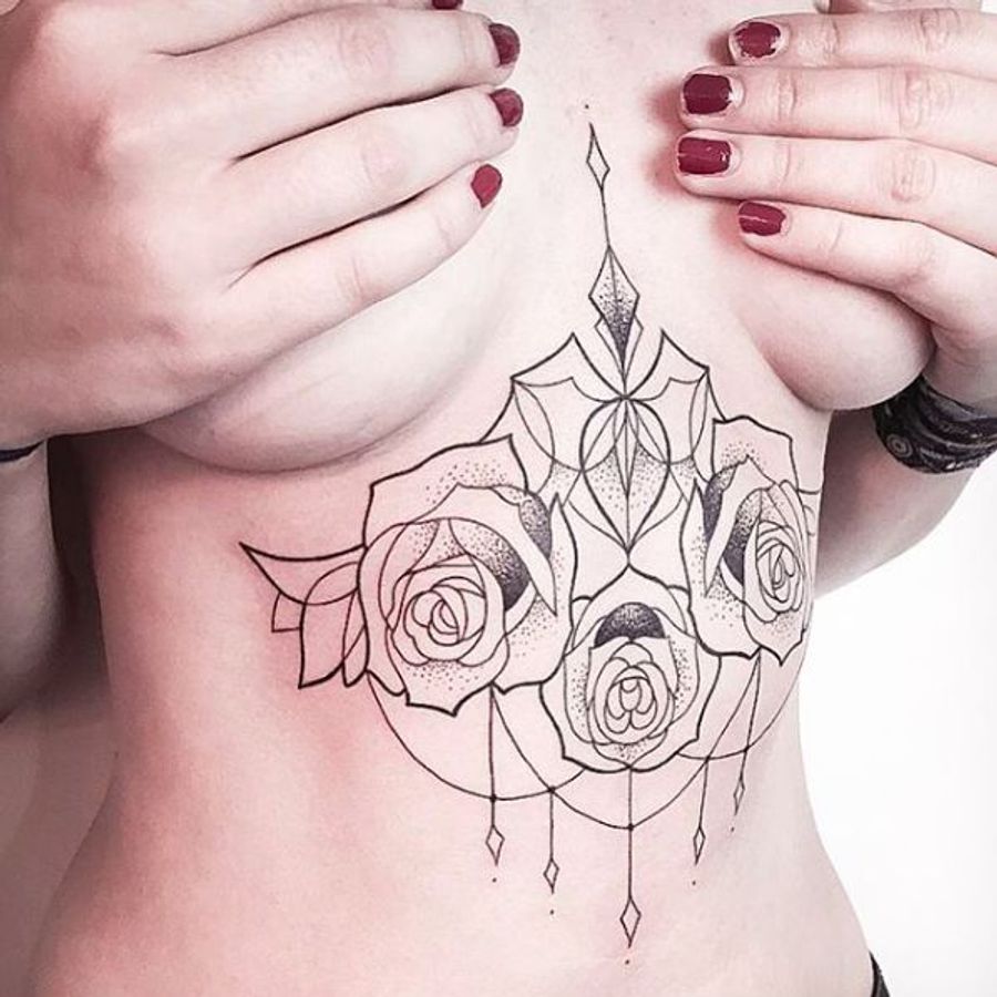 Underboob rose design #MelinaWendlandt #roses #floral #linework #dotwork #btattooing #sternum #underboob #subtle