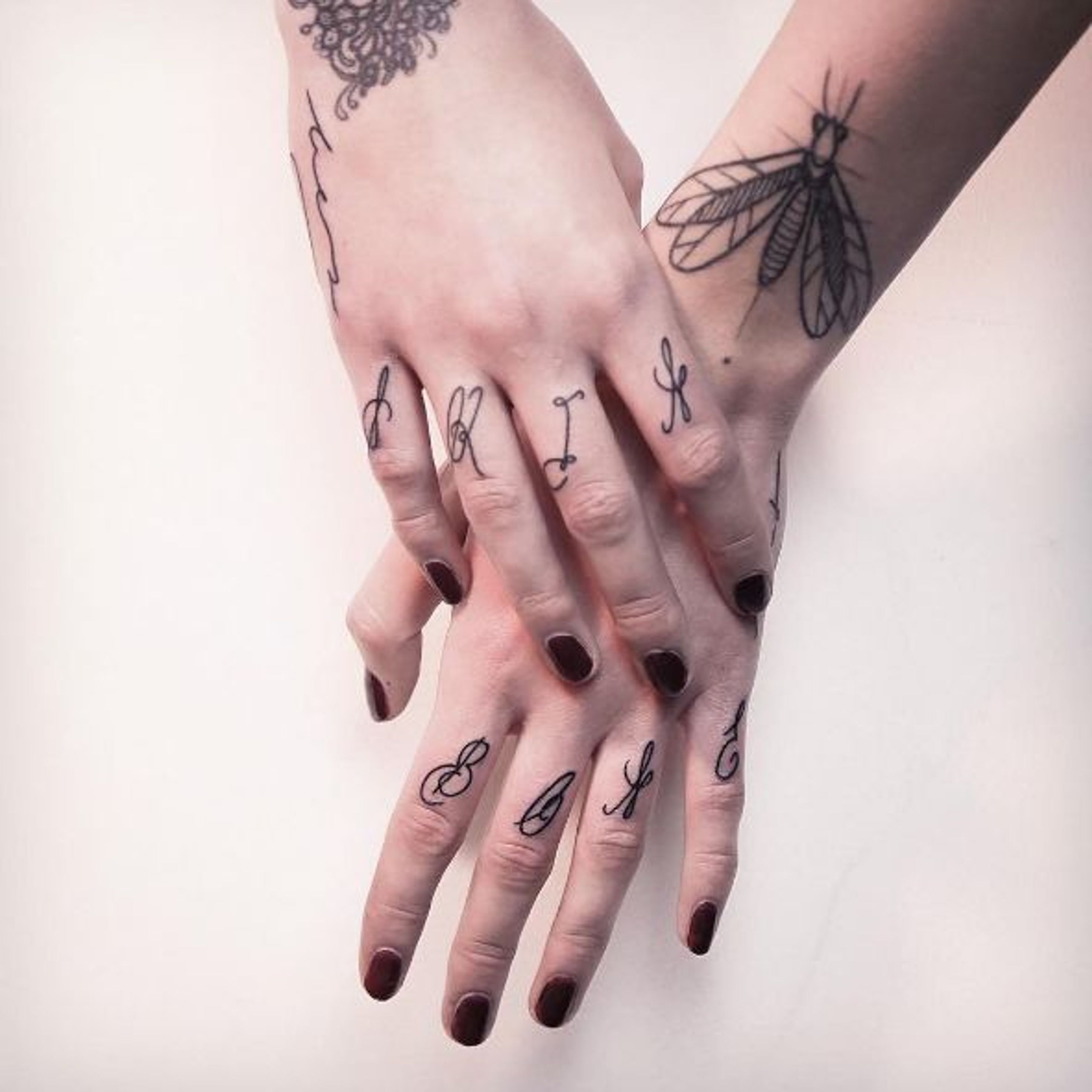 Linework on fingers #MelinaWendlandt #linework #dotwork #lettering #fingertattoo #subtle #fineline #btattooing