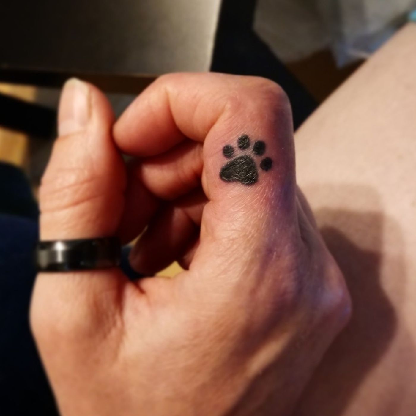 A tiny cat paw on the inside of the client's right index finger