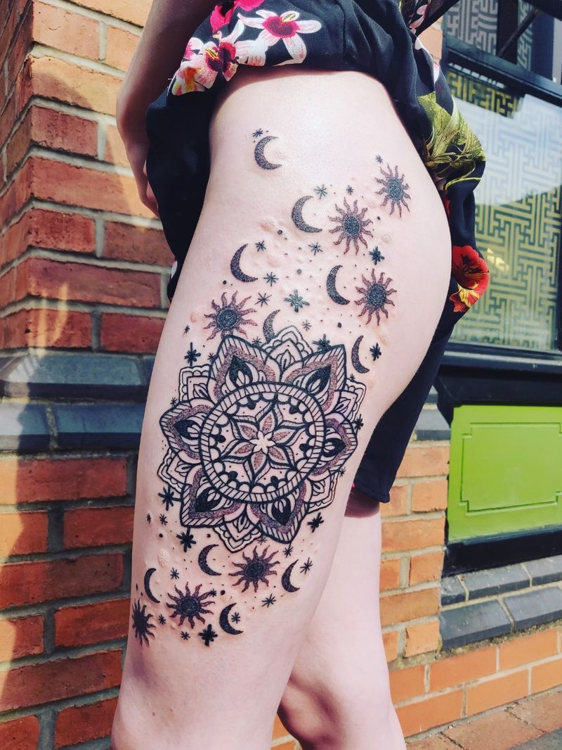 Beautiful Mandala style leg piece done down to a tee with adding my personal interests onto it to make it mine - Love 💖