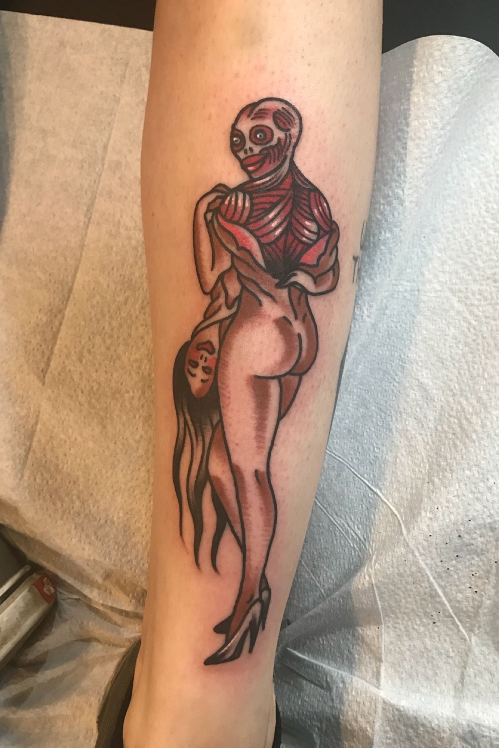 So this piece was one if the most fun ever! Leah asked me to make a pin up girl taking off her skin... so this i what resulted and it reminds me of the #hellraiser series from back in the day. Anyone familiar with clive barker? If not do yourself a favor and watch the hellraiser movies. Thet were ground breaking in thier time. #pinupgirl #traditionaltattoo