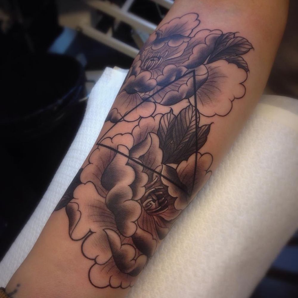 Tattoo by Liam Ryan #LiamRyan #MotorinkFinestTattooing #Amsterdam #flowers #floral #peony #peonies #traingle #plant #nature #leaf