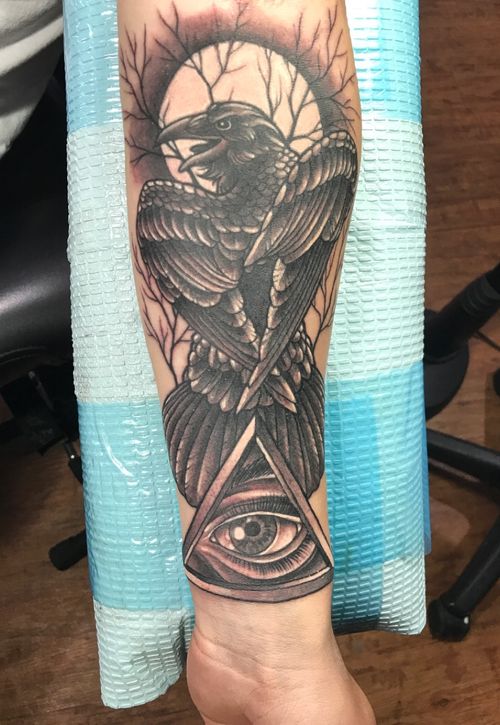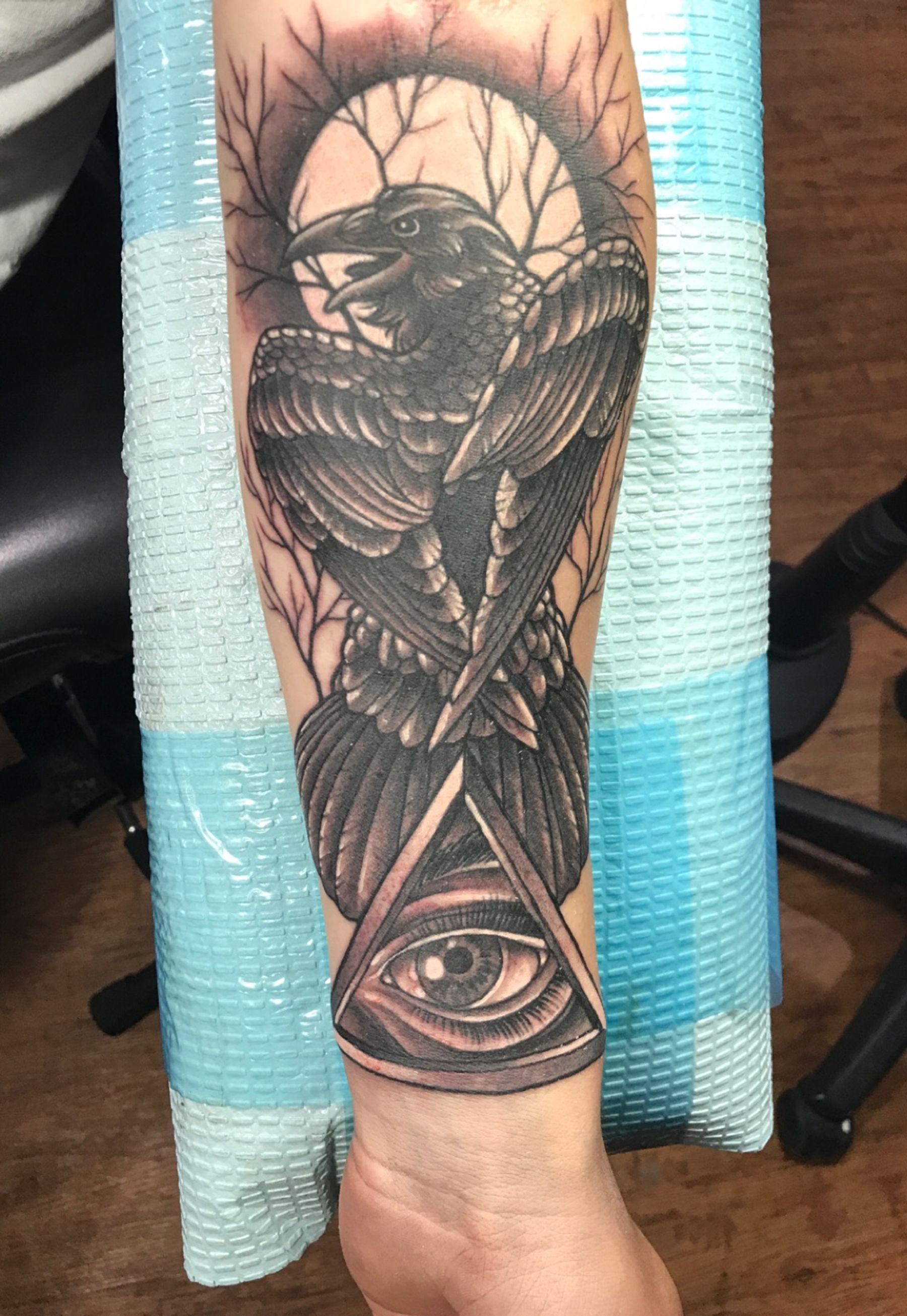 Sort of a neotraditional raven with tree branches and a full moon behind it, also an all seeing eye at the bottom. Artist: John Kautz. Studio: The Silver Key Tattoo. #tree #branches #fullmoon #moon #raven #bird #neotraditional #blackandgrey #allseeingeye #illuminati #eye #triangle