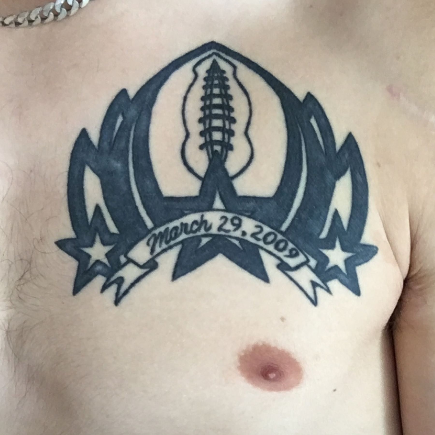 1st piece. Football design w/ memoriam for my grandfather. Reads “March 29, 2009”.