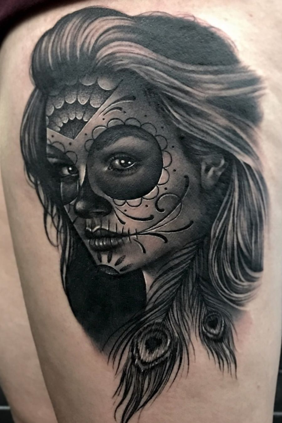 #dayofthedeadgirl #dayofthedead #blackandgrey #thightattoo #realism