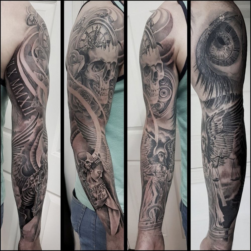 Finished of sleeve By G .... #blackandwhitetattoo #realistic #darkart #tattooideas #realistictattoo #raptattoo #tattoo #tattoodesign #bngtattoo #portraittattoo #tattoosminar #tattootechnique #celebritytattoo #realism #healedtattoo #blackandgrey #blackandgreytattoo #angeltattoo #pocketwatchtattoo #skulltattoo #skull