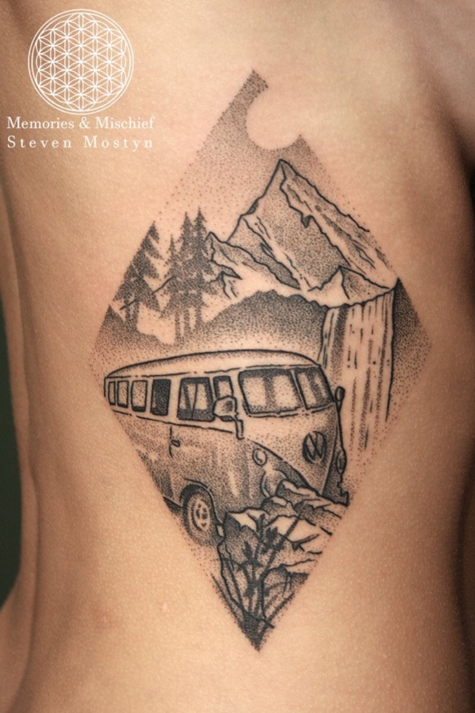 Dotwork VW Camper with mountain landscape, designed and tattooed by Mister Mostyn. #dotwork #landscape #mountains #waterfall #VWbus #vwcamper #volkswagen
