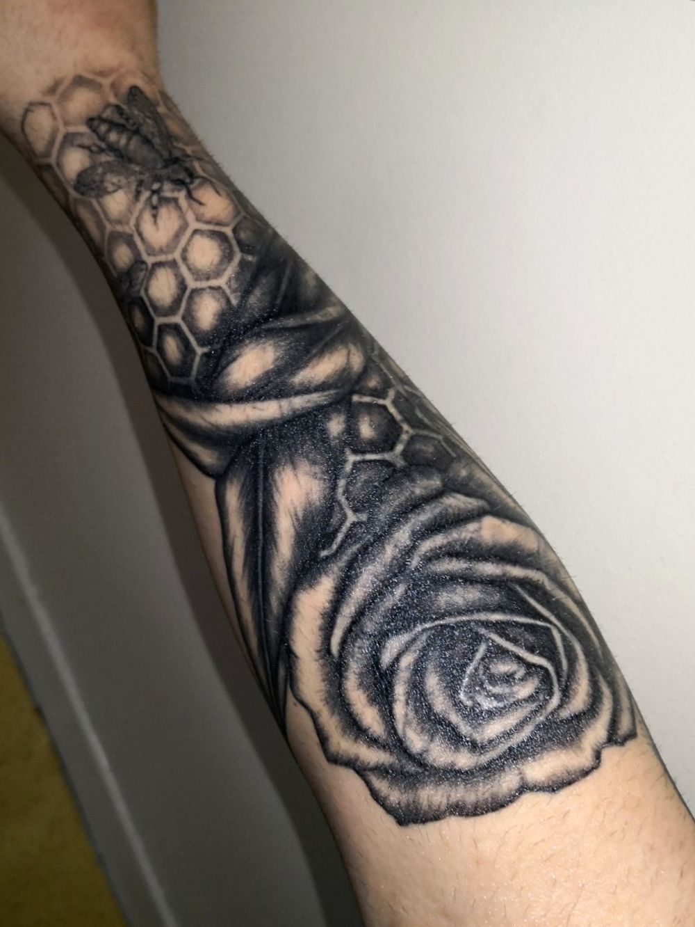 On continue de recouvrement de mon tatouage 😁#tatouage #recouvrement #tattoocoverup #tattoo #bee #abeille #ruche #lencredemarine #flower #rosestattoo #france #