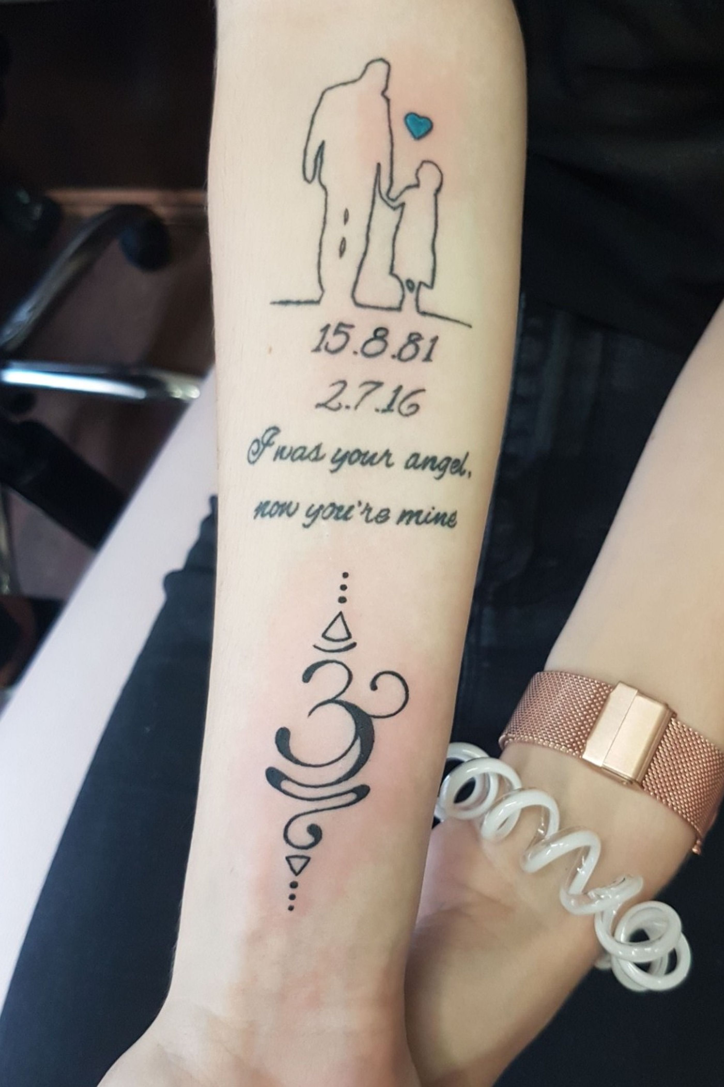 For my dad who passed away due to suicide, the sign is the OM. He believed in Hinduism so I thought I'd get this piece to honour him. The placement is due to him having my name tattooed in the same place.