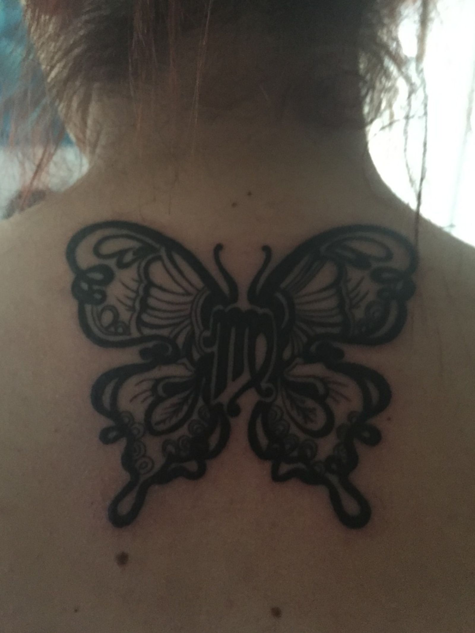 Butterfly tattoo with Virgo star sign as the body on top of spine