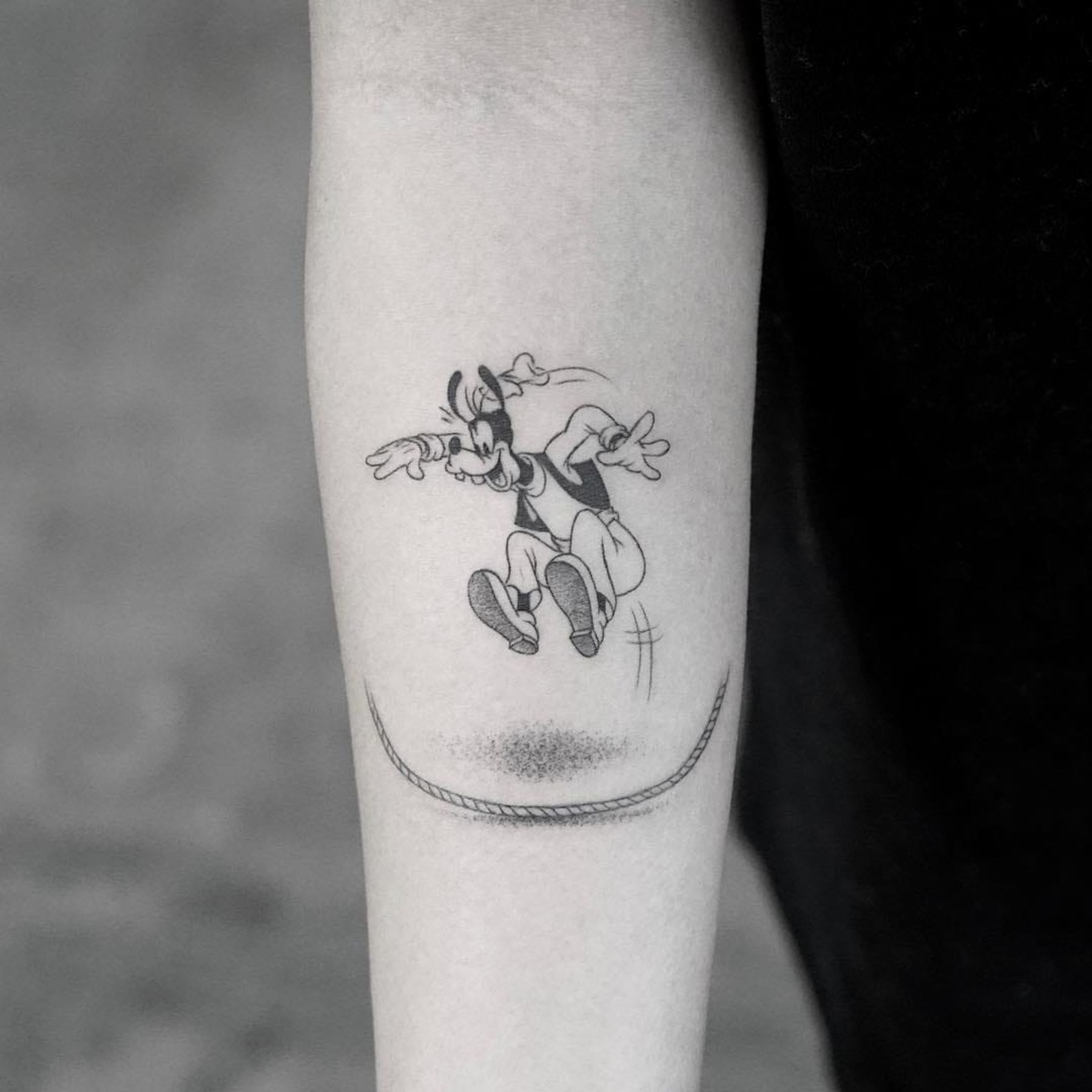 Tattoo by Mr K #MrK #tvshowtattoo #tvshow #tvtattoo #blackandgrey #cartoon #Disney #Goofy #jumprope #cute
