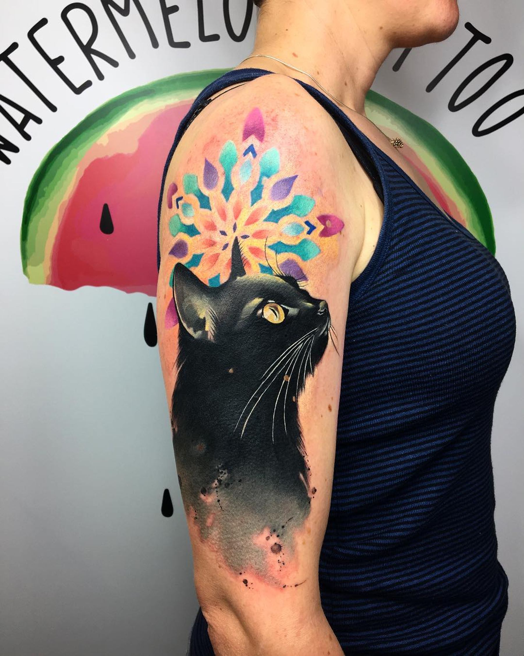Cover up tattoo by #naiomitattoo at #watermelontattoo #davincicartridges #watercolor #cat #colorfultattoos #coverup