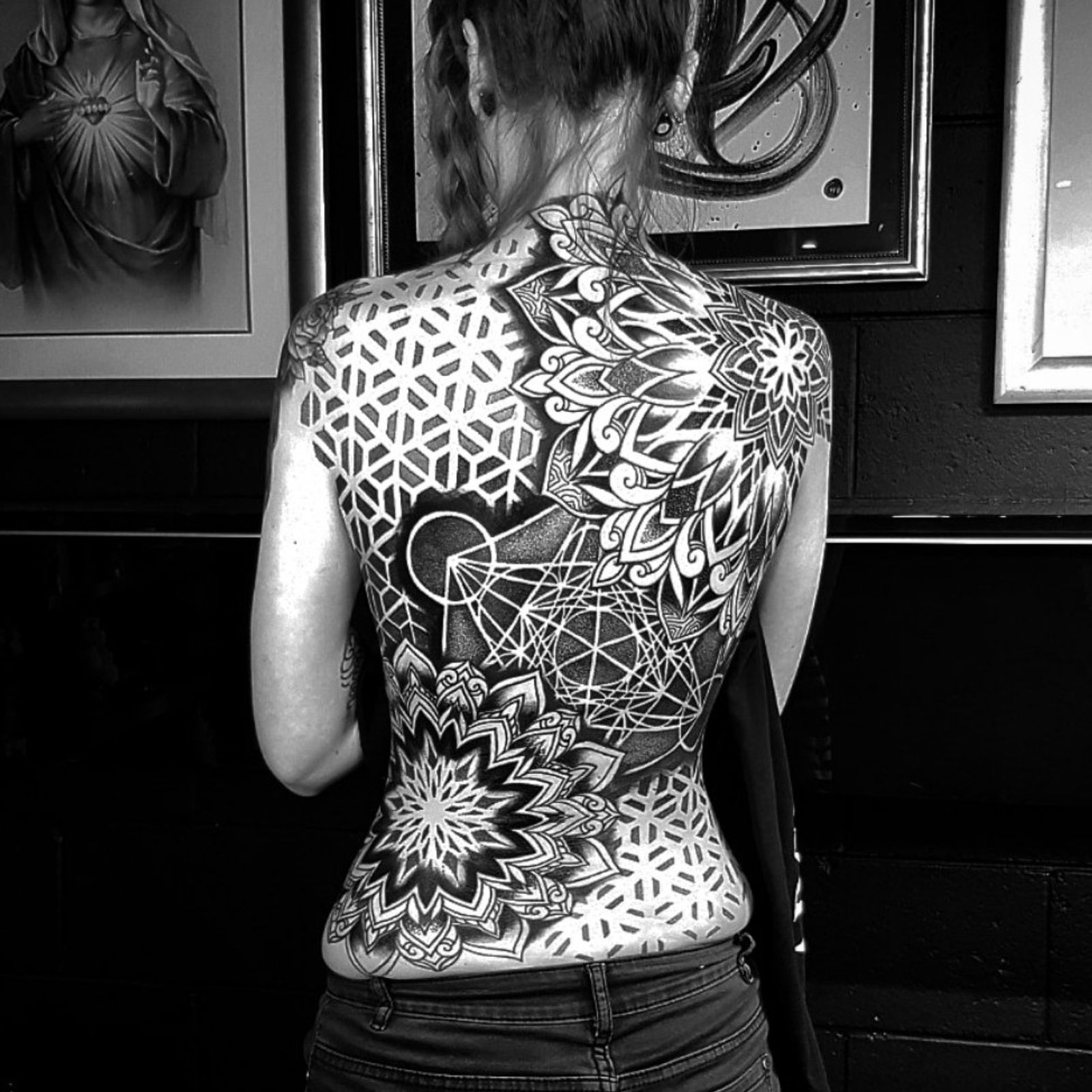 Geo back on Janene #inkjecta #metrixneedles #mandala #geometrictattoo #linework #dotwork #sleeve #blackworkers #tattrx #backpiece