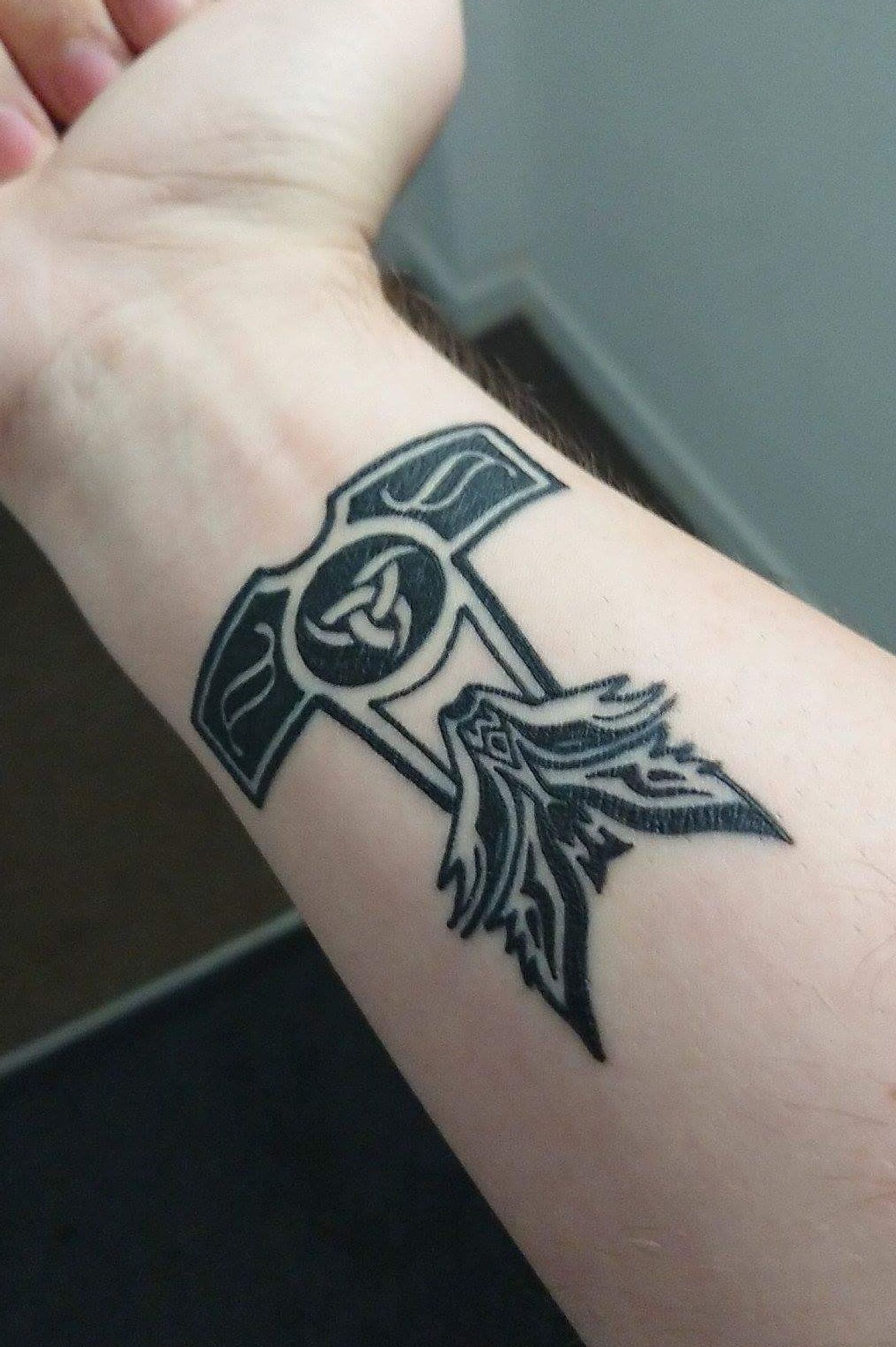 This was my first tattoo, mjolnir with odins horn and wolf symbology. Designed myself. August 2017 #Pagan #mjolnir #heathen