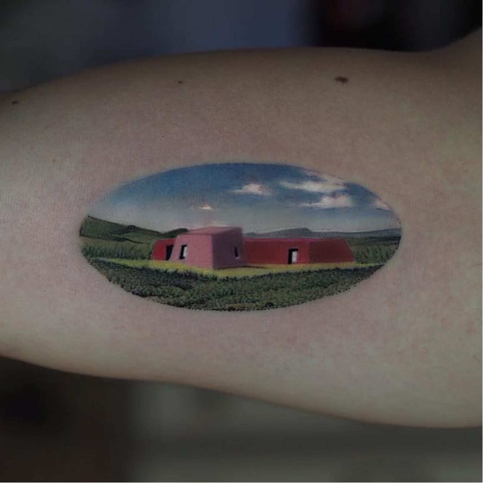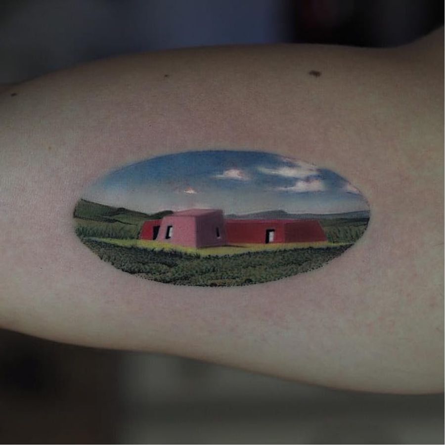 Tattoo by Jefree Naderali #JefreeNaderali #landscapetattoos #landscape #land #nature #environment #surreal #building #sky #grass #architecture #home