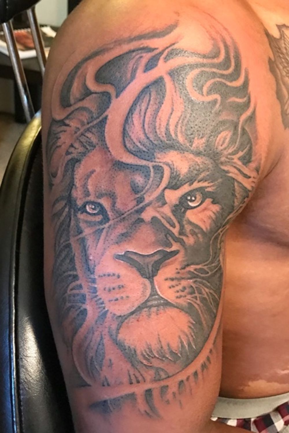 Lion Half Sleeve #lion #liontattoo #realism #realistic #jungle #kingofthejungle #Africa #shading #shouldertattoo #shoulder