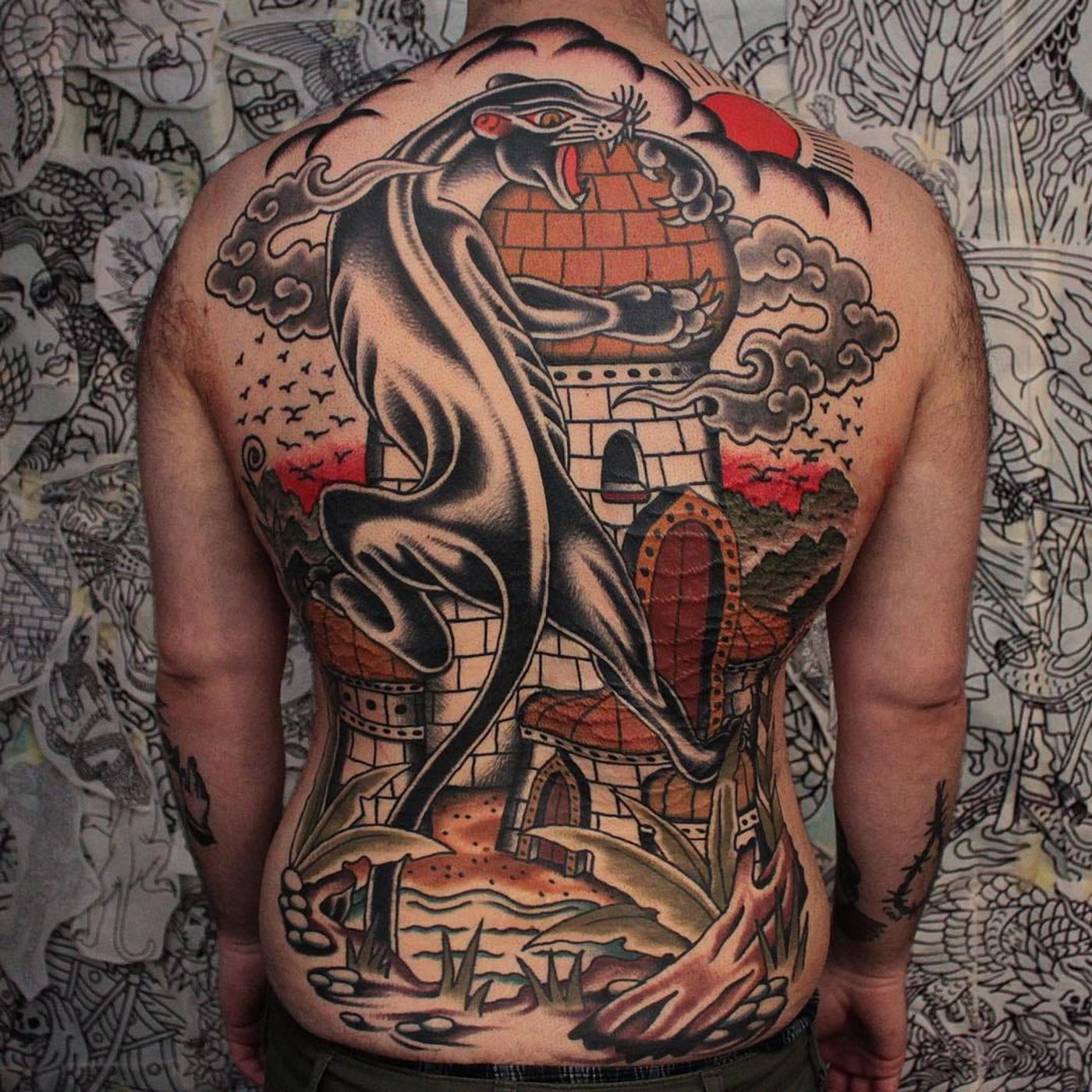 Tattoo by Joel Soos #JoelSoos #blackpanthertattoos #blackpanther #junglecat #cat #backpiece #tower #castle #clouds #birds #nature #water #lake #backtattoo