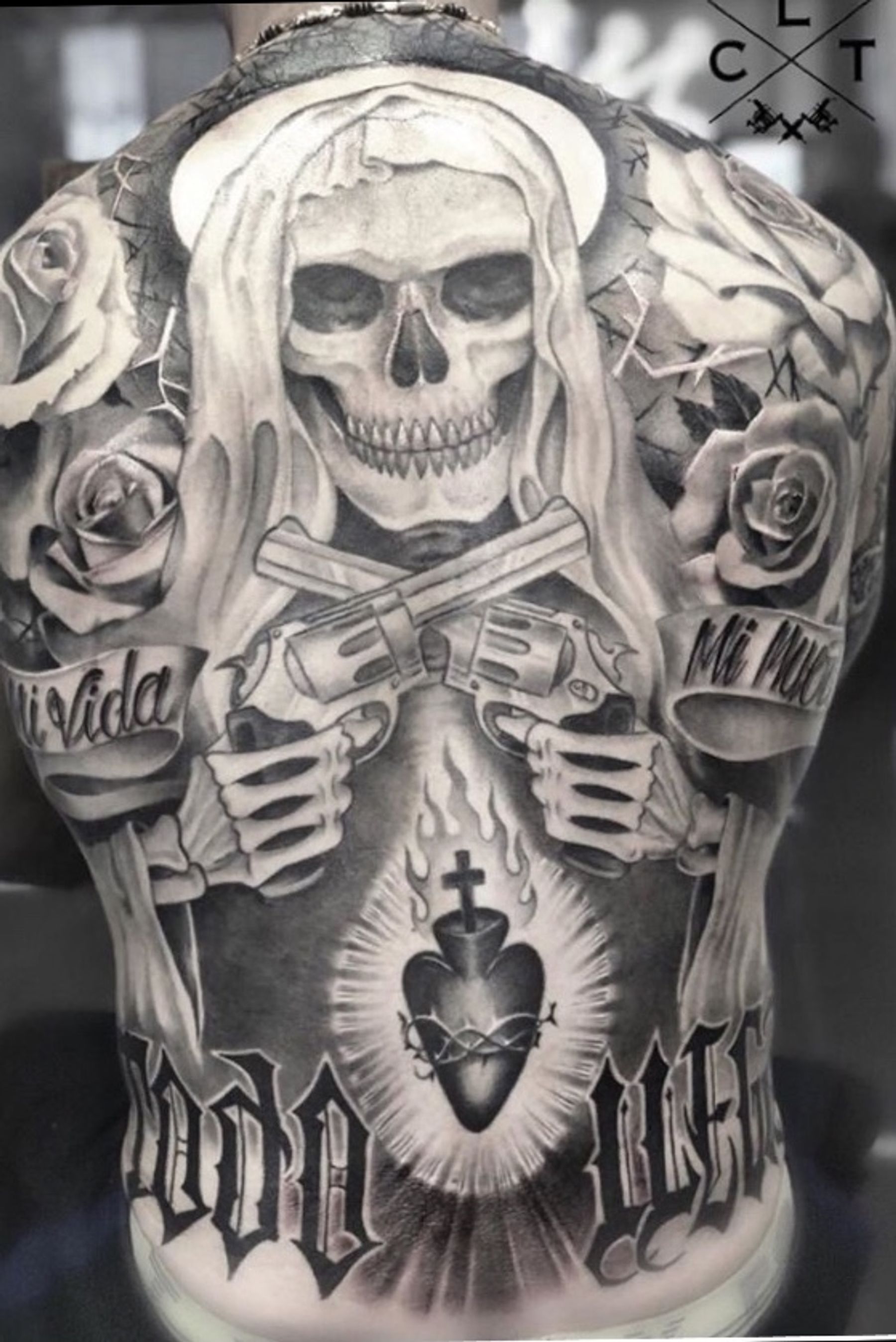 Black and gray tattoo. Skull tattoo. Chicano tattoo. Negro/gris tattoo. Skull tattoo. Calavera tattoo. Guns tattoo. Roses tattoo