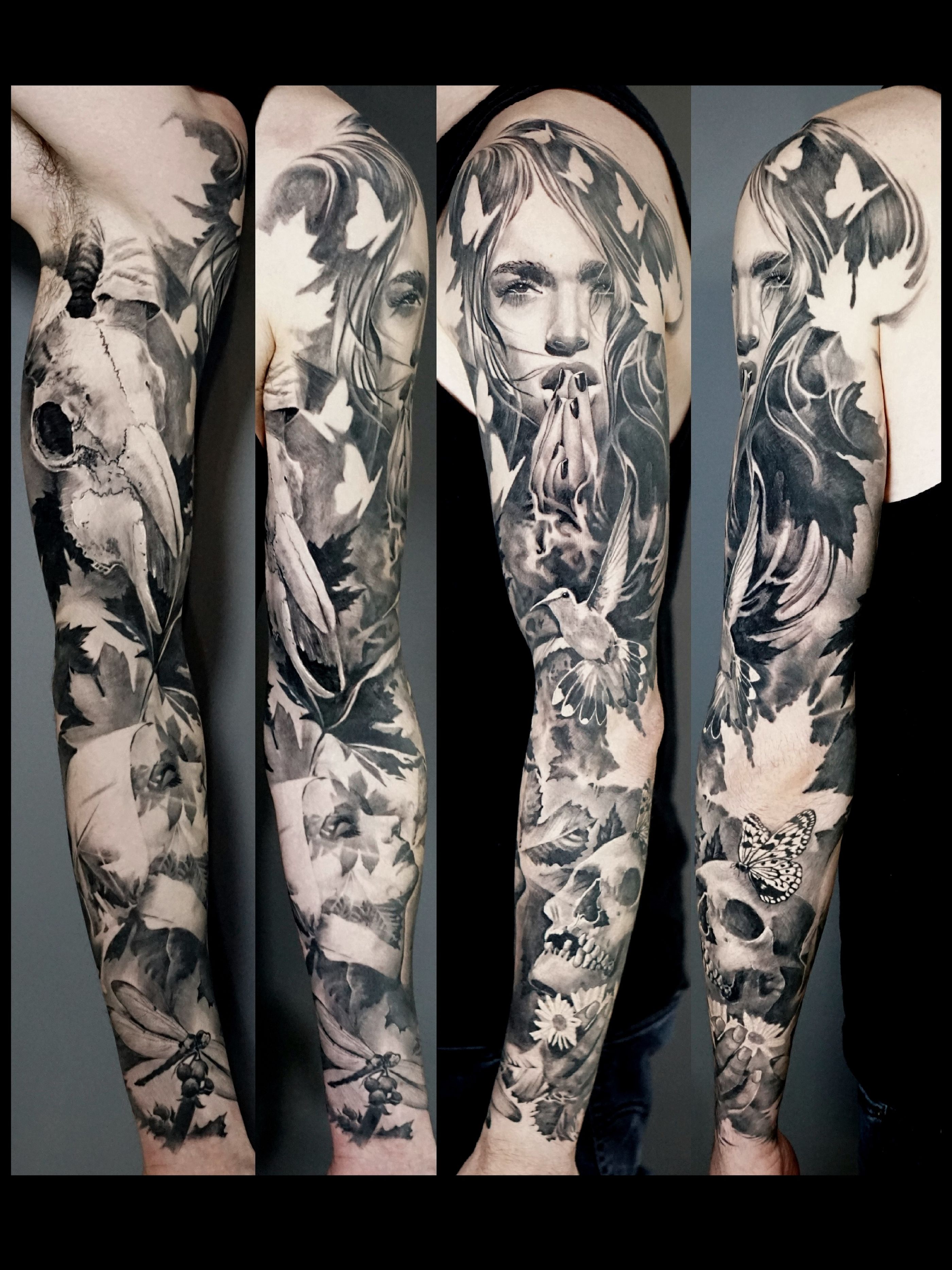 Black and grey healed full sleeve tattoo of life and death www.alolocotattoo.com