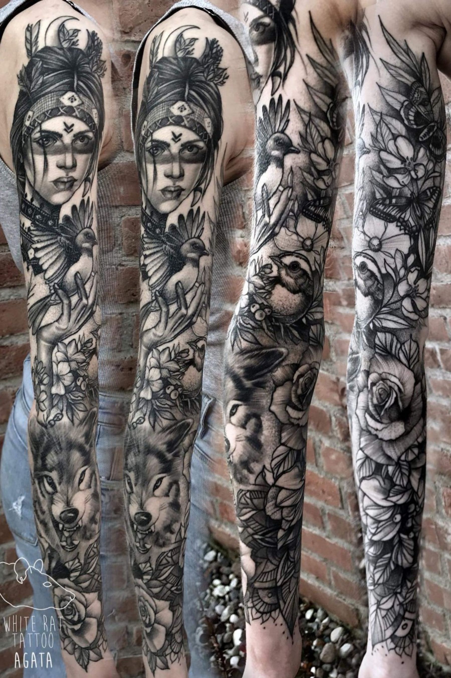 #girl #flower #bird #wolf #rose #sleevetattoo